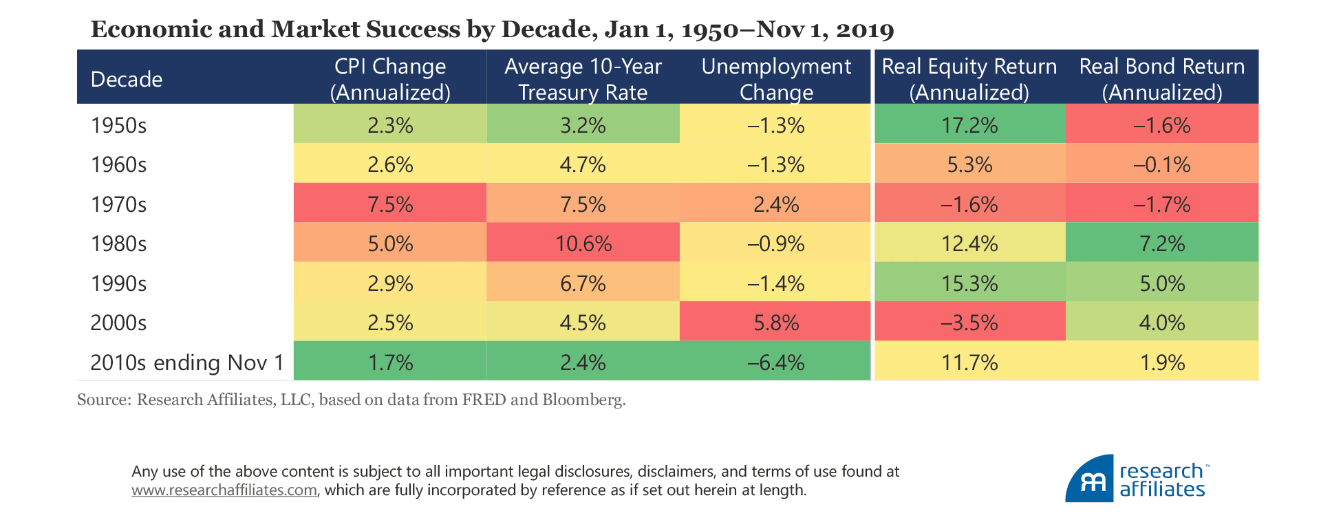 During this economically extraordinary decade, real (i.e., net of inflation) US equity market returns at 11.7% a year were middle of the pack versus the post-WWII experience. The recovery after WWII and the two-decade recovery from the stagflation decade of the 1970s all produced better equity returns than the 2010s. Meanwhile, real bond returns were similarly average, coming in at 1.9%, wrapping up a three-decade decline in bond yields since the Volker era.