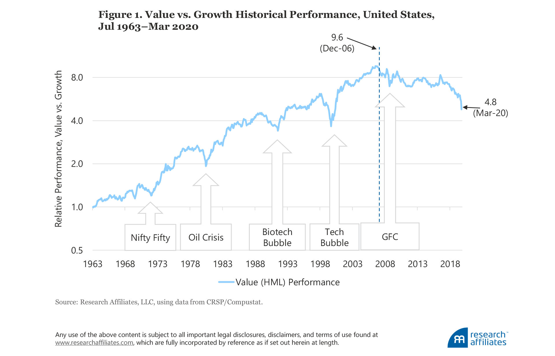 Prior to the most recent period of underperformance, the value factor had experienced steady growth over the prior half-century, albeit temporarily interrupted by events such as the Nifty Fifty surge in the early 1970s, biotech bubble in the early 1990s, and tech bubble in the late 1990s, as illustrated in Figure 1. Unsurprisingly, the latest emergence of a deep, persistent bout of underperformance is raising questions about whether value is structurally impaired.