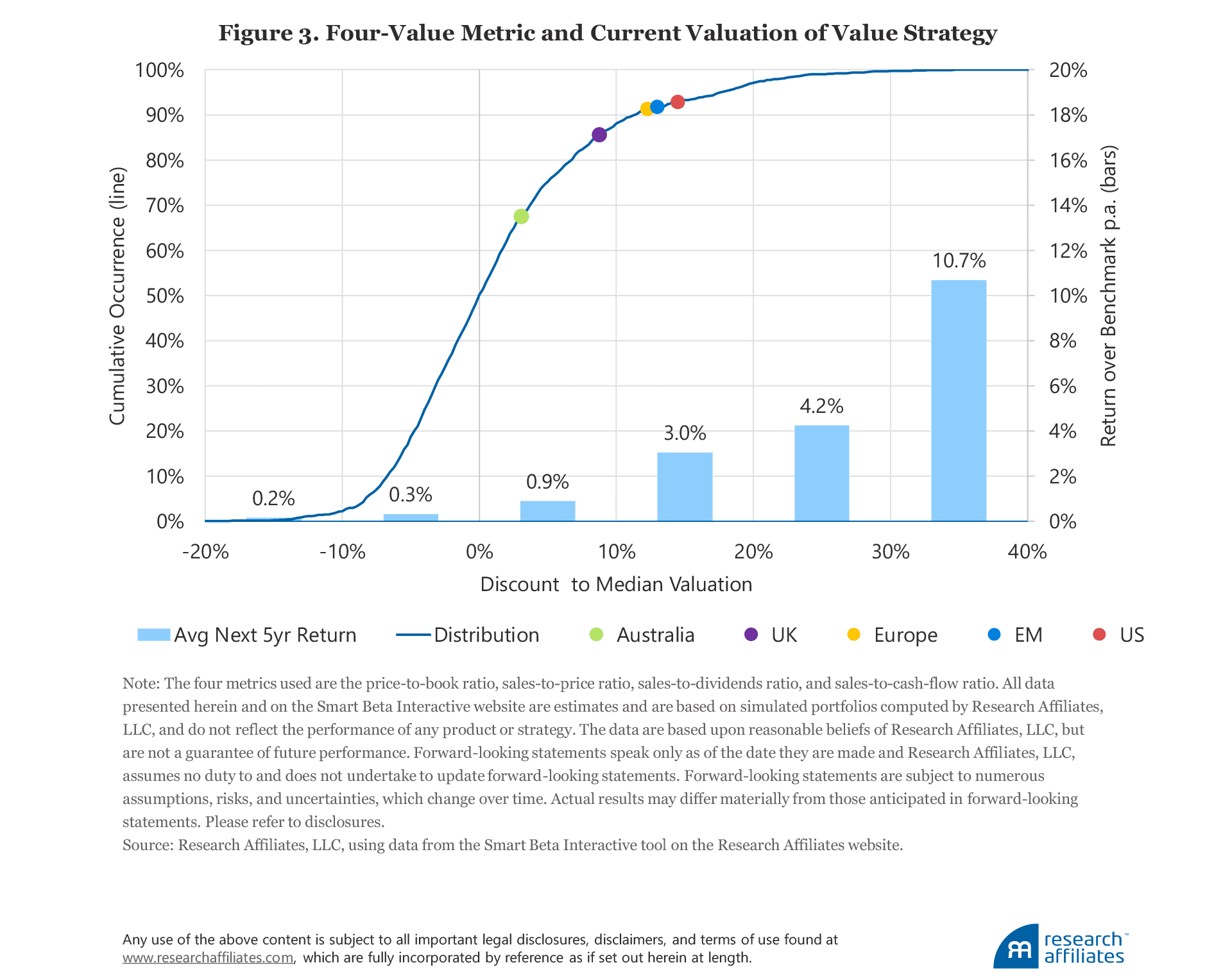 Before we delve into our forward-looking prospects for value versus growth, we should acknowledge that studying value through just one lens, the P/B ratio, and that building an uninvestable factor by equally weighting large and small companies could lead to a skewed view of the factor. Therefore, we will expand our definitions of value to include the sales-to-price ratio, sales-to-dividends ratio, and sales-to-cash flow ratio in each of the following regions: United States, Europe, United Kingdom, Australia, and Emerging Markets.