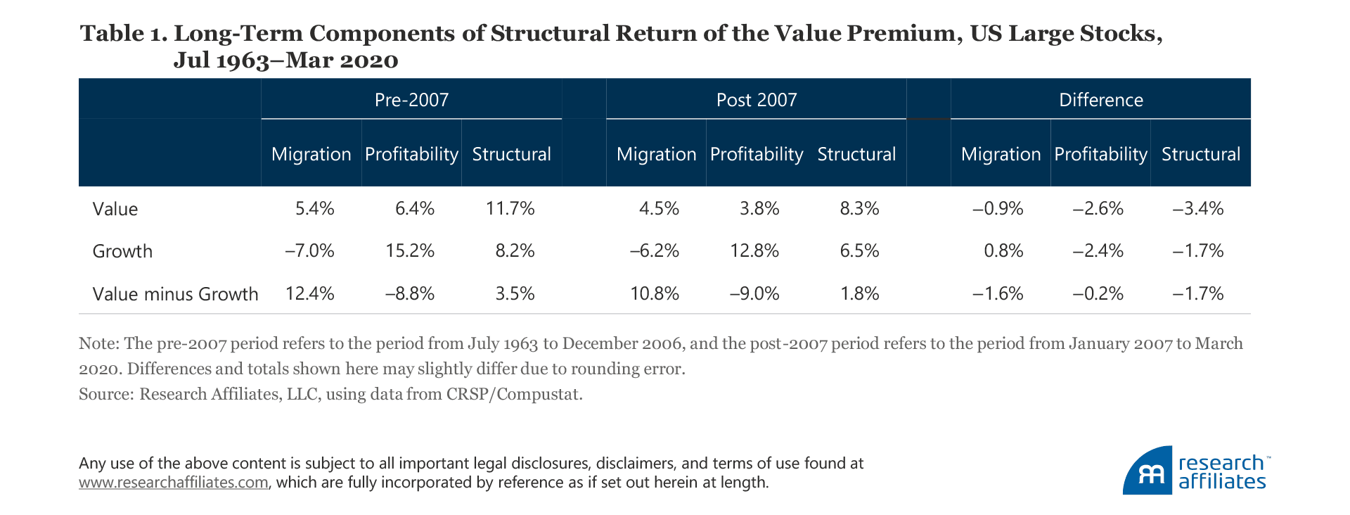 Our simple model decomposes the returns of value relative to growth. The framework attributes the relative performance to three components: migration, profitability, and change in relative valuation. Our evidence suggests that migration (e.g., individual value stocks becoming growth stocks) and profitability are not materially changed over the pre- and post-2007 periods. These two components, which we refer to as structural return, are a net positive contributor to the value premium.
