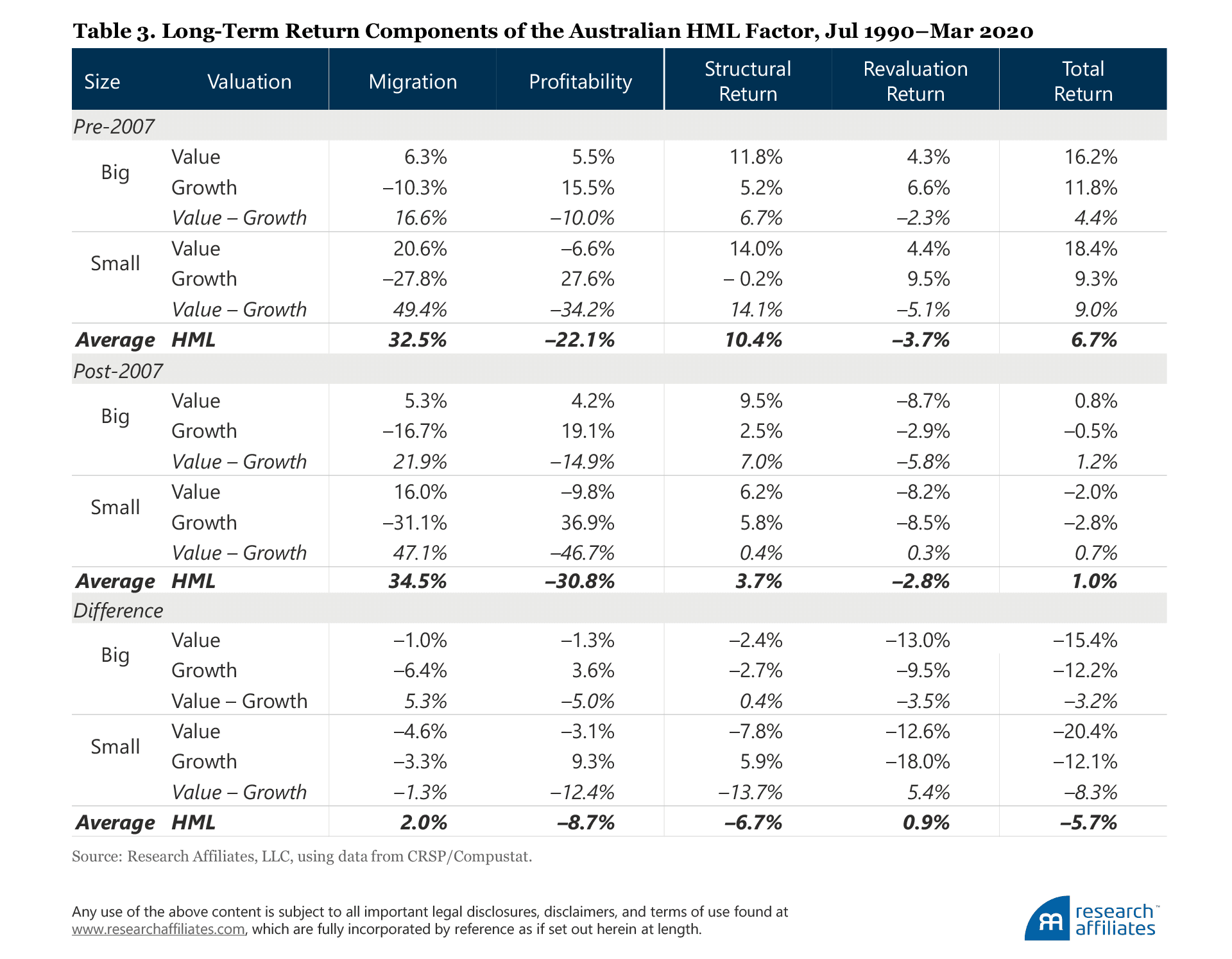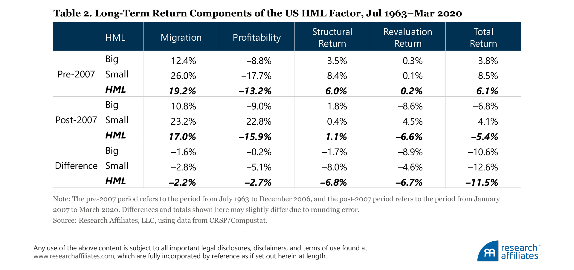If value investing is dead, we would expect it to be a global phenomenon. As such, studying a similar decomposition analysis domestically may offer additional insight. We observe two time horizons—July 1990 through December 2006 (pre-2007) and the 13.3 years afterwards (post-2007)—as shown in Table 3.
