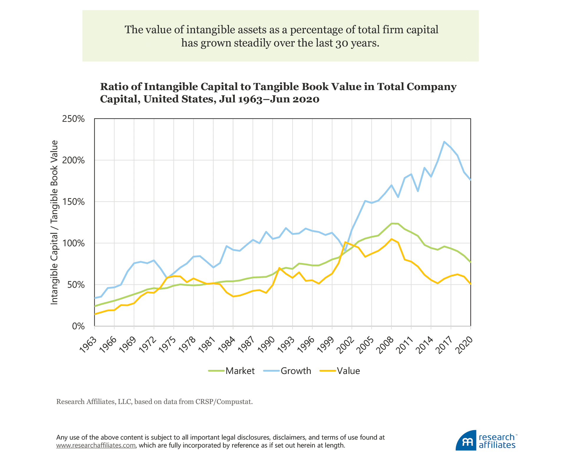 As intangible assets such as knowledge, intellectual property, and human capital become more important to firms’ successes, intangibles’ share of total company capital has grown meaningfully. In 1963, the average firm’s intangible assets were roughly 24% of the size of its book value of tangible assets. The relative size of intangibles has since more than tripled to represent 77% of the average firm’s tangible book value (Arnott et al., 2020).