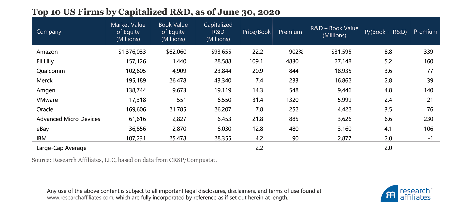 The…increase in the size and role of intangibles makes including them necessary in a truly comprehensive measure of a firm’s capital.Of course, not every firm on the list has a multiple that shrinks so close to the multiple of the average company. Amazon tops the list with capitalized R&D spending more than $30B larger than its book value. The firm remains, however, quite expensive even after factoring in this massive R&D outlay. On a pure P/B basis, Amazon is more than 10 times the price of the average company (22.2 times versus 2.2 times). After we include R&D spending, it remains expensive at nearly 4.5 times the price of the average company (8.8 times versus 2.0 times). Amazon is not the only exorbitantly priced company that still looks extremely expensive after incorporating R&D.