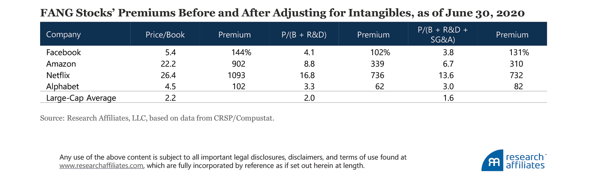 The FANG stocks (Facebook, Amazon, Netflix, and Google/Alphabet) all trade at a substantial premium to the average company in terms of both P/B and P/B + R&D. Tacking on additional intangible assets in the form of SG&A (selling, general, and administrative expenses) does not narrow the premia.