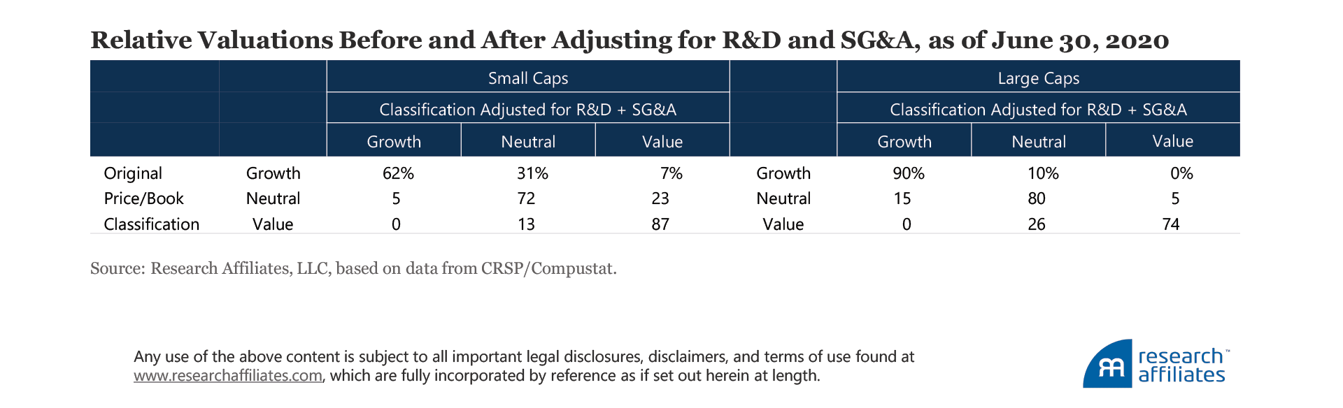 We do not recommend using P/B alone to determine a company’s valuation because it is an incomplete measure of firm capital.We can track the relative valuation of each firm both before and after we add each measure of intangibles to P/B. First, we sort the universe of companies by NYSE median-cap stock to classify large versus small. Next, we separately sort by valuation, labeling the cheapest 30% as value, the most expensive 30% as growth, and the middle 40% as neutral. Only 64% of small caps categorized as growth solely according to P/B would continue to be categorized as growth if we value all firms by P/(B + R&D). Under the P/(B + R&D) valuation, 30% of the firms move into the neutral category, while 6% of the firms’ R&D spending is so large relative to their book values they jump all the way from growth to value.