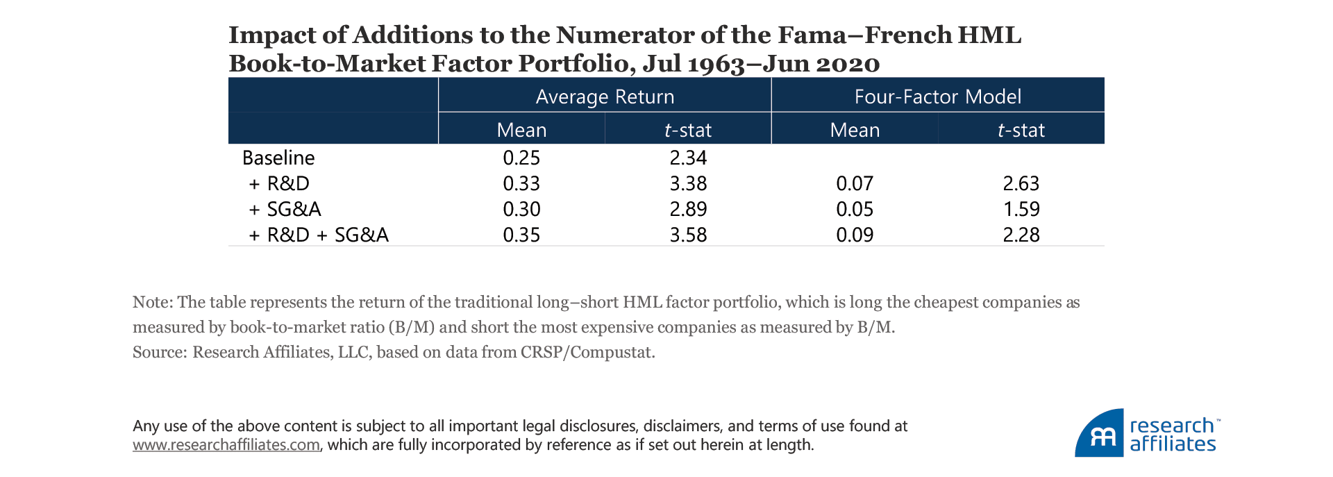 We construct an HML (high-minus-low) value factor using the Fama–French (1993) methodology. We first examine the performance impact on value investing by adding knowledge capital (R&D) to baseline HML. The performance of HML improves by eight basis points a year (0.33 versus 0.25) when R&D expenses are capitalized and added to book value. Similarly, organization capital, represented by a fraction of spending on SG&A, tends to improve the performance of value investing by five basis points a year (0.30 versus 0.25).