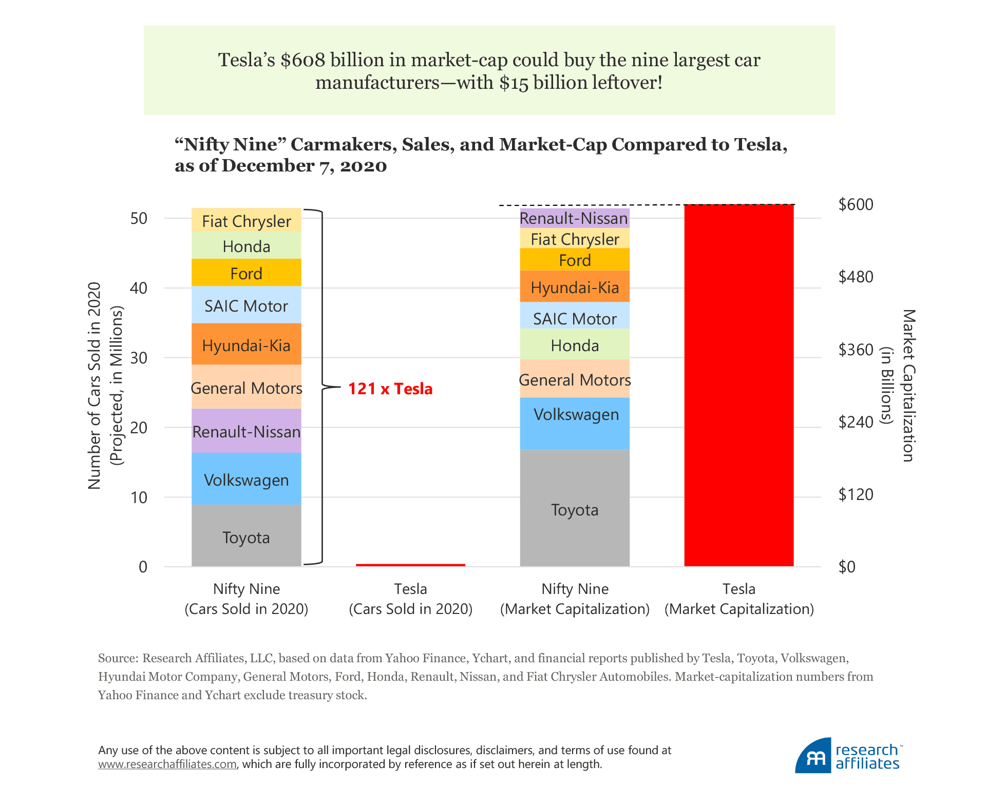 What else could we buy with $608 billion? Let’s consider the EV market. Renault-Nissan, Volkswagen, and Hyundai-Kia are the second, third, and fourth largest EV producers with 13%, 11%, and 8%, respectively, of EV market share.6 Combined, these three organizations are responsible for 32% of EV market share, about 10% larger than Tesla (and growing roughly as fast), but together are valued at $172 billion, barely one-fourth of Tesla’s value. Of course, these entities produce a lot more than just electric vehicles. The equivalent of Tesla’s current valuation can buy not only all of the electric vehicles these three organizations sell (actually 10% more than Tesla produces), but also about 27 million of the non-electric vehicles they sell each year, close to 60 times Tesla’s likely 2020 EV sales, with $436 billion to spare!