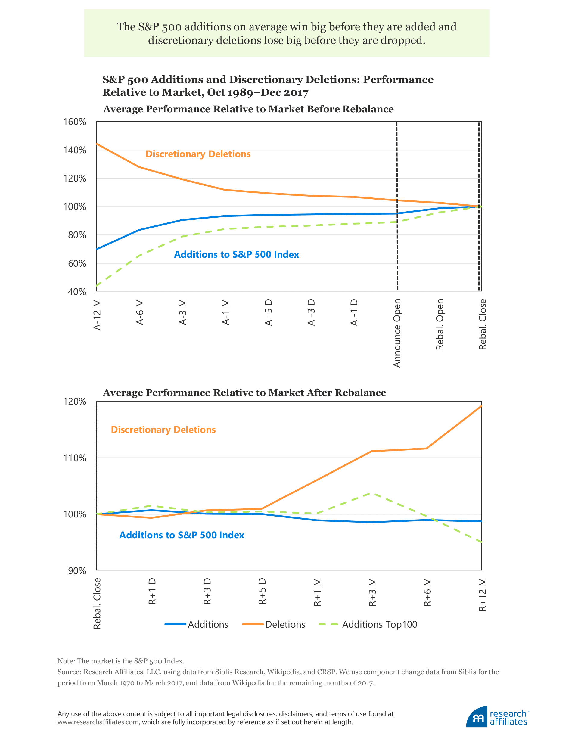 In our 2018 study, we found the S&P 500 additions, on average, win big before they are added and discretionary deletions lose big before they are dropped. The average addition to the index typically rises 43% relative to the market (S&P 500) in the 12 months prior to the close of the rebalancing day. If the addition is a mega-cap (ranking in the top 100 or higher by market capitalization), the average gain is 127%. Conversely, the average deletion loses 31% over the same time span.