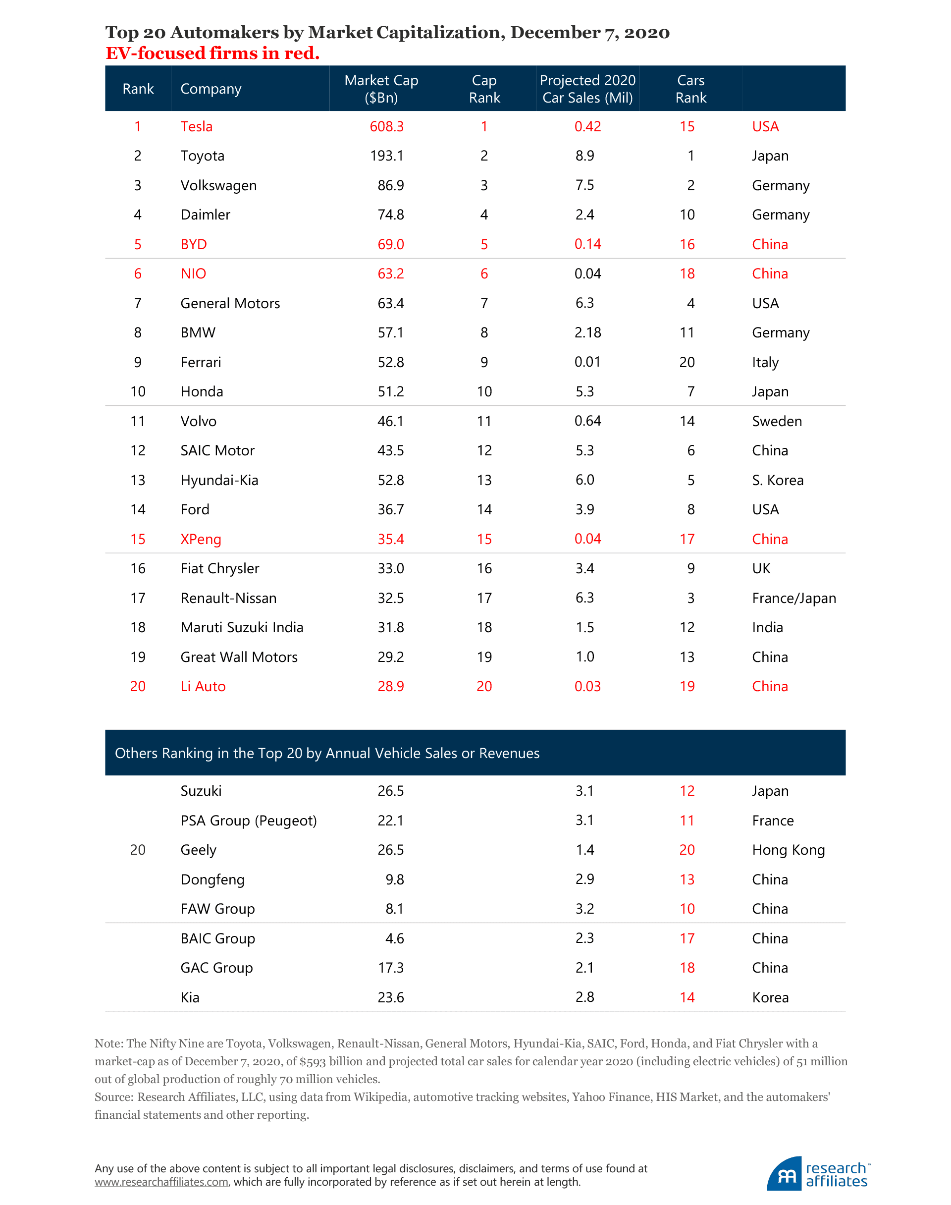 Appendix: Summary of Top 20 Automakers by Market Cap, Car Sales, and Revenues