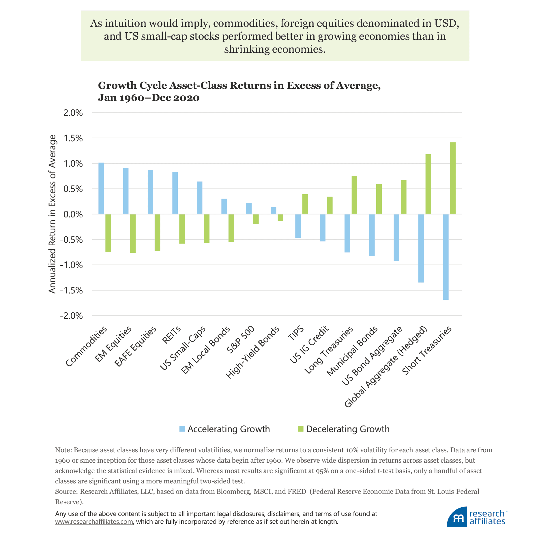 Adding credence to our measurement of growth are intuitive results across many of the asset classes in our sample. For example, US small-cap stocks, foreign equities denominated in USD, and commodities had a higher average return in times of higher-than-average growth than they did in times of negative shocks. Conversely, bonds, most notably short-term government bonds, outperformed in months when growth was contracting. No surprise then that the performance of asset classes having both stock and bond qualities, such as investment-grade and high-yield bonds, fell somewhere in the middle, producing less-significant results.