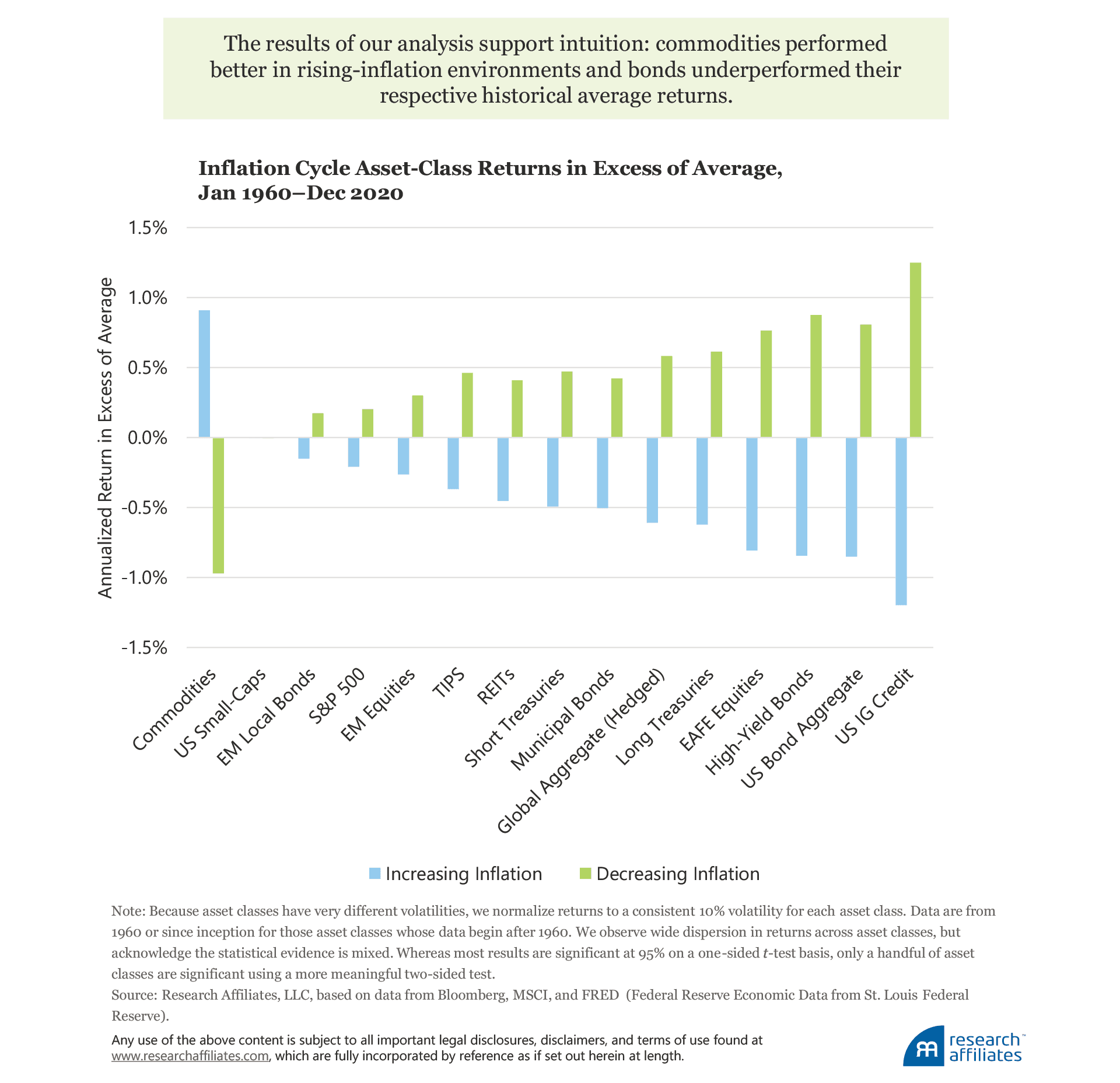As with growth, certain results consistent with intuition add to the credence of our measurement technique. For example, commodities performed better in rising-inflation environments. On the flip side, fixed-rate investments, Treasury and investment-grade bonds, and foreign stocks all underperformed their respective average return in positive inflation-shock environments. We find that inflation protection from TIPS (Treasury Inflation-Protected Securities) has been suspect, consistent with the findings of Ang (2012).