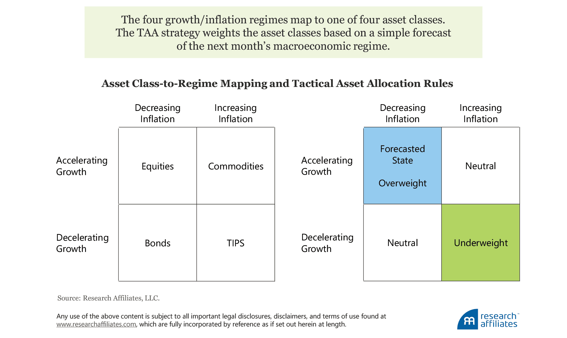 Massive growth in central bank balance sheets via quantitative easing, debt monetization, and firing of “big bazooka” stimulus packages may give the business cycle a renewed level of importance in the years ahead.We construct an equally weighted benchmark that allocates 25% to each of the four asset classes. We also construct a tactical asset allocation (TAA) strategy by mapping each asset class to one of the four quadrants as follows: accelerating growth/decreasing inflation (equities), accelerating growth/increasing inflation (commodities), decelerating growth/increasing inflation (TIPS), and decelerating growth/decreasing inflation (bonds). We increase the weight of the asset class if our expectation of growth and inflation in the next business-cycle stage aligns with that asset’s quadrant. The asset class mapped to the quadrant that is diagonal from the overweighted quadrant is underweighted.