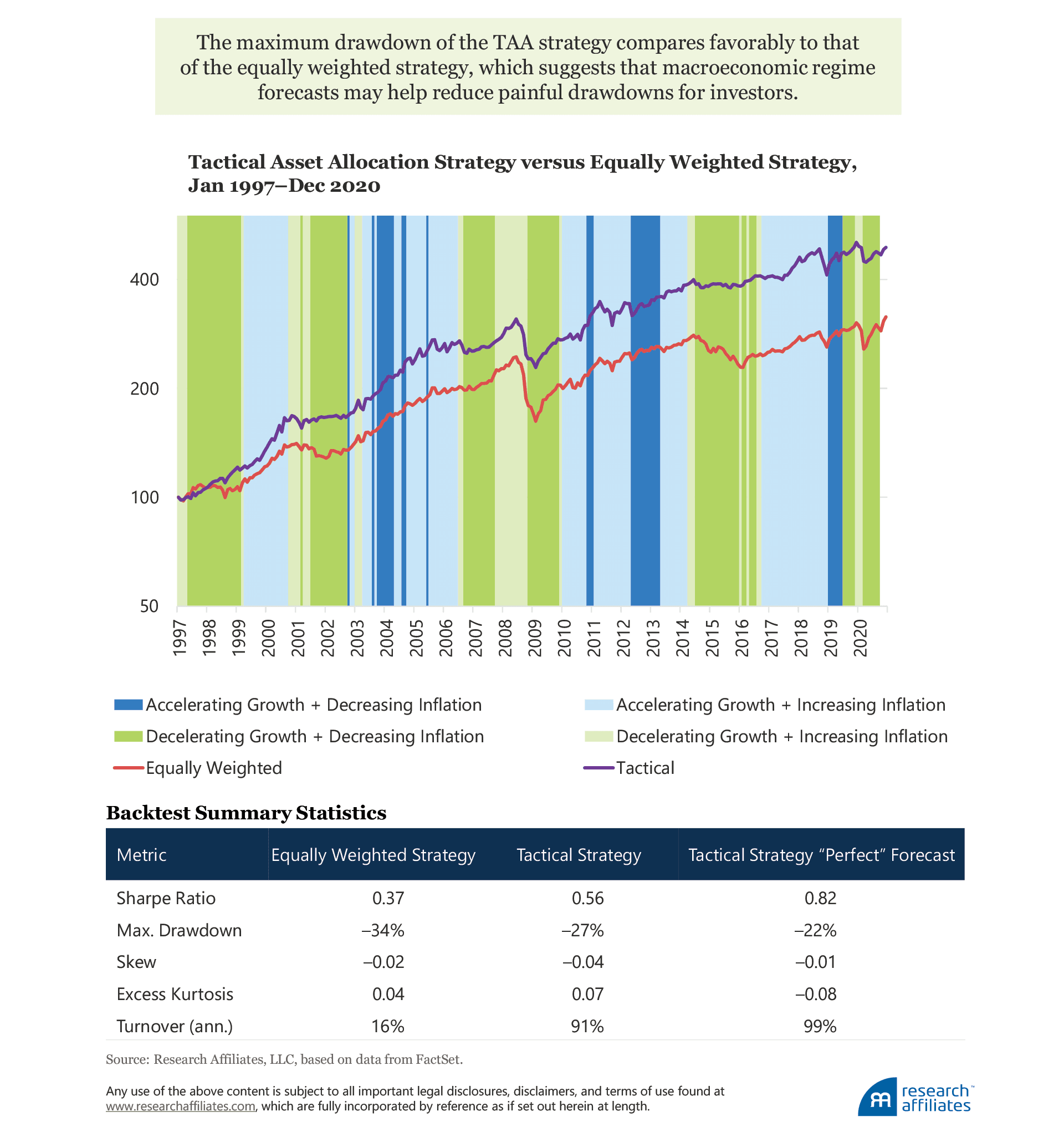 The backtest for the TAA strategy spans January 1997 through December 2020. In the appendix, we provide results from a backtest that begins in 1976, and which required the modeling of synthetic assets such as TIPS. In each backtest, we rebalance monthly both the equally weighted benchmark and the tactical strategy portfolio. The macroeconomic regime expectations we described previously drive the tactical strategy.