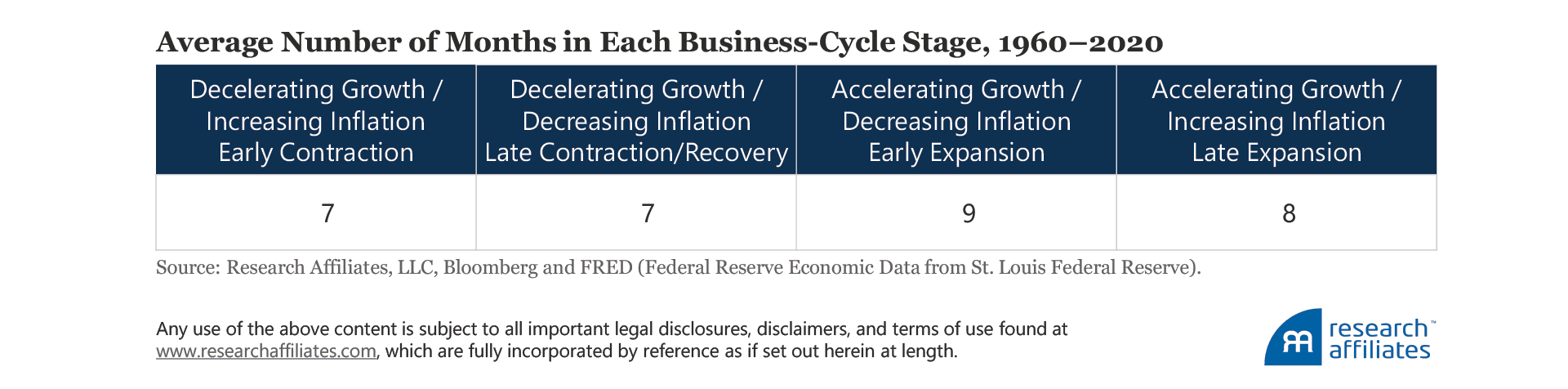 Ideally, in mapping these two variables to the stages of the business cycle, we would gain confidence by observing persistence. After all, the business cycle does not normally jump between stages month over month, whereas simple measures of growth and inflation might do just that. We do in fact observe persistence, given that the average number of months in each stage is about eight (or three quarters), meaning a full four-stage cycle would last three years.