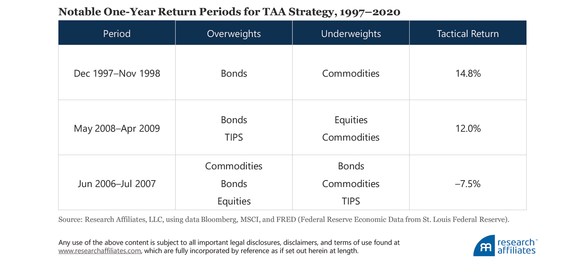 June 2006–July 2007: In this one-year period in the mid-2000s, the price of WTI crude oil pulled back from the mid-$90s a barrel to under $80 a barrel. Over this time, the TAA portfolio was overweight commodities, resulting in a −5.5% tactical return. The subsequent rebound in oil prices to an all-time high unfortunately coincided with the strategy's late underweight to commodities resulting in an additional −2.0% tactical return. The significant underperformance during this one-year period was driven primarily by the overweight to commodities during a major oil price correction.