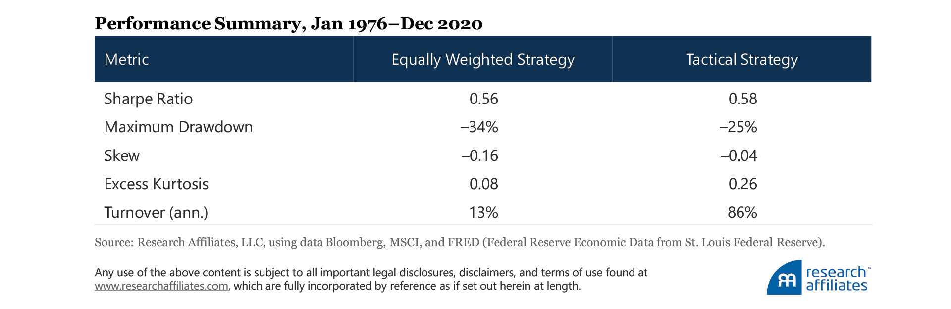 The favorable comparisons were achieved without significant deviations in the return distribution characteristics of the tactical and equally weighted strategies, including skewness (−0.04 versus −0.02, respectively) and excess kurtosis (0.07 versus 0.04, respectively). Unsurprisingly, turnover is much higher in the tactical strategy (91%) than in the simple equally weighted benchmark (16%), yet is still within reason for many investors. For the purpose of our simple horse-race proof of concept, we do not attempt any additional complexity with respect to turnover management.
