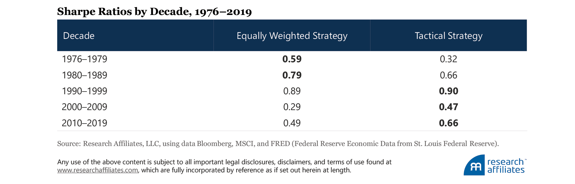 Why does the tactical strategy’s outperformance decrease relative to the benchmark when we extend the backtest to 1976? We examined the portfolios decade by decade and observed that for the periods prior to the original backtest, the tactical strategy meaningfully underperformed the equally weighted benchmark, particularly in the latter half of the 1970s (0.32 versus 0.59).