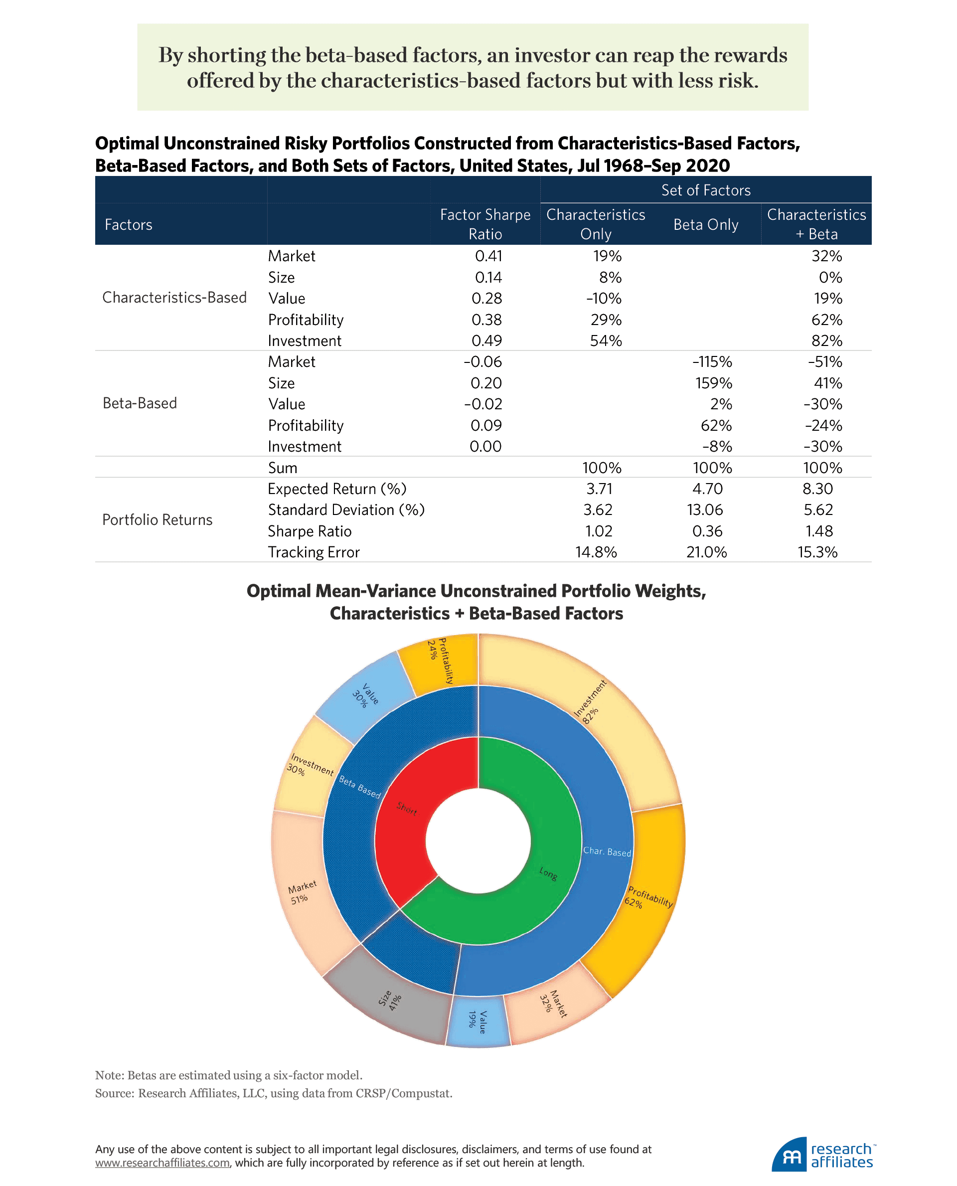 Characteristics- and beta-based factors have exposure to the same risks. For example, when the characteristics-based value factor does poorly, typically the beta-based value factor also performs poorly. This commonality means that an investor holding the characteristics-based factors could use the beta-based factors to manage some of the factor risks. In order to measure the extent to which investors could use the beta-based factors to their benefit, we construct three optimal risky portfolios—characteristics only, betas only, and a combination of the two—and analyze them over the period July 1968–September 2020.