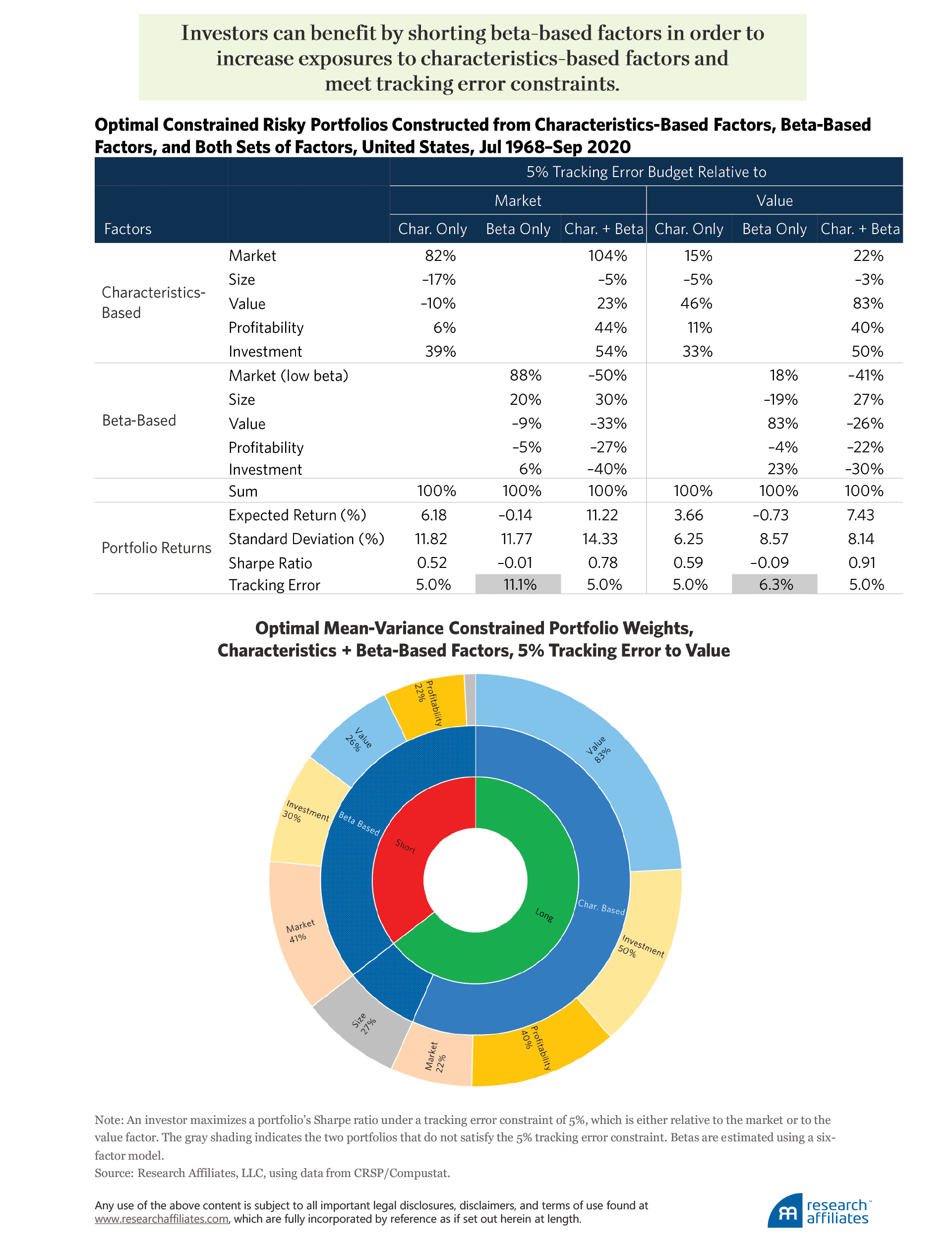 The two optimal constrained portfolios constructed using a combination of characteristics- and beta-based factors, however, meaningfully benefit investors. By shorting four of the beta-based factors, investors are able to increase their exposures to the characteristics-based factors, meet their tracking error constraints, and earn Sharpe ratios of 0.78 (versus the market) and 0.91 (versus the value index).