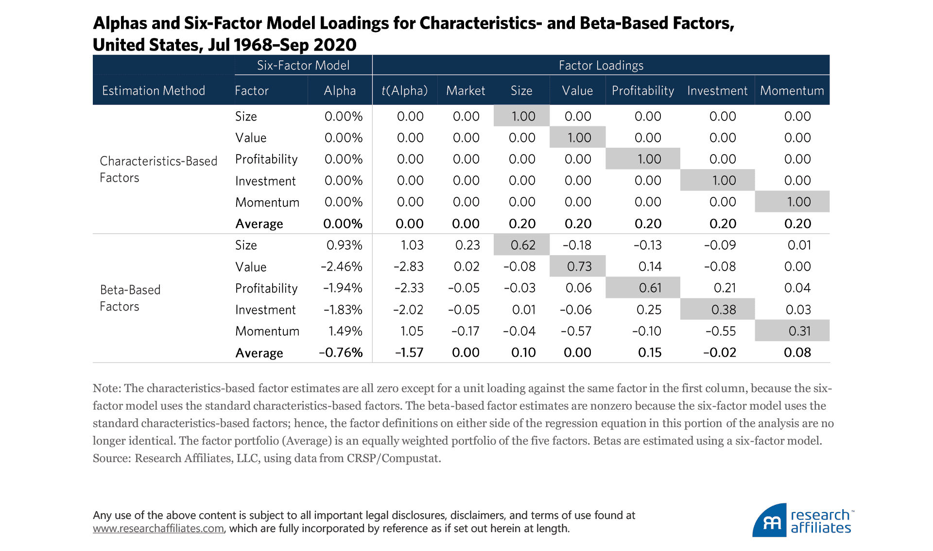 The alphas on three of the beta-based factors—value, profitability, and investment—are statistically significantly negative at the 5% level. What is the intuition for these negative alphas? Although these three beta-based factors earn close-to-zero returns, their positive loadings against the corresponding characteristics-based factors imply they behave very much like the standard characteristics-based factors. Therefore, when we compute the alphas on these factors, the model says these factors should earn almost as high a return as the characteristics-based factor. According to the model, the premium on the beta-based value factor, for example, should be approximately 0.73 × 2.9% = 2.1%. The premium in our calculations, however, is just −0.2%. Therefore, after making the appropriate risk adjustment using the six-factor model, the model leaves these beta-based factors with negative alphas.3