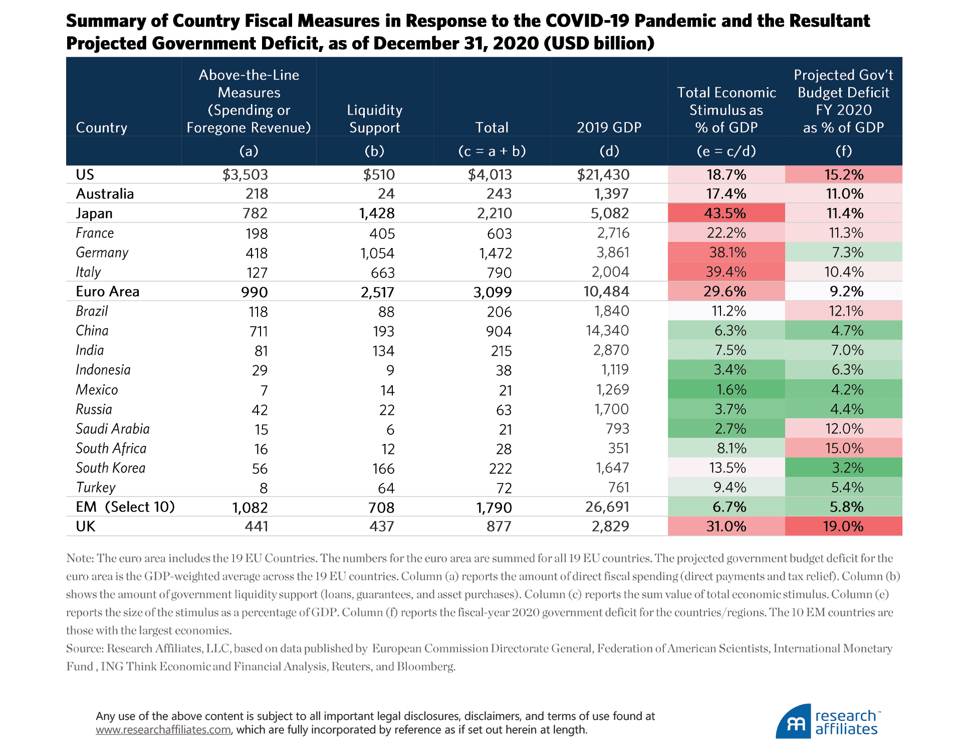 Japan’s COVID-related stimulus package—overwhelmingly focused on monetary stimulus—amounted to 43.5% of its 2020 GDP, the highest of all countries and regions. The Japanese government strongly favored liquidity support over direct transfer payments to businesses and individuals (2-to-1 ratio). This major stimulus package, and Japan’s ability as an island nation to keep the pandemic at bay, did not save the nation from a 5% slump in GDP.