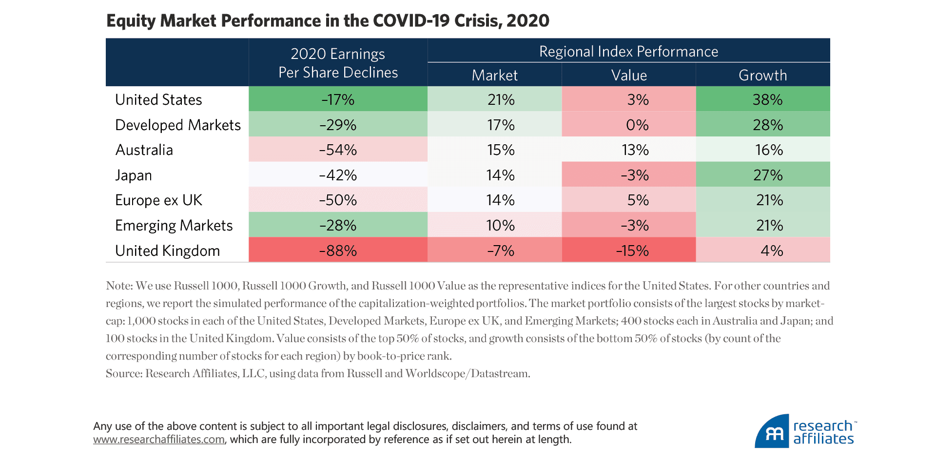 The global flight to safety and the behemoth stimulus packages drove the US equity market to appreciate 21% in 2020. US growth stocks—especially tech companies, in many cases direct beneficiaries of the pandemic—did better still, appreciating 38%. Meanwhile, value stocks, which experienced slower growth and typically weaker profit margins, were harder hit by the COVID market shock and fared much worse (3%). Investors’ high risk aversion to the economic uncertainty of the pandemic significantly weighed on value strategies around the globe, with the exception of Australia. The addition of Brexit uncertainty to the pandemic concerns fed strong negative returns in UK equities in general (−7%) and for value strategies (−15%).