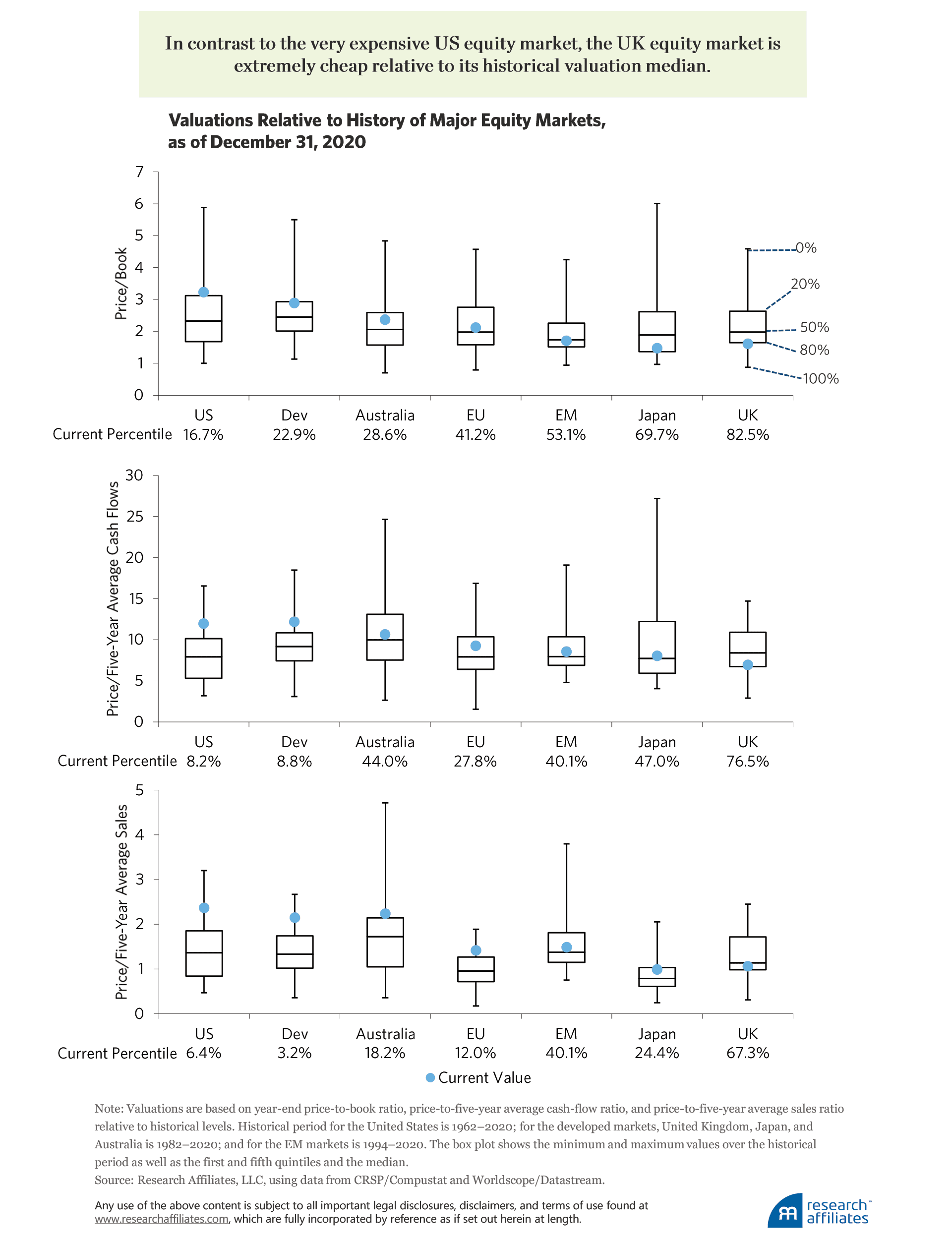 The UK equity market stands out as trading cheaper than our last named trade of the decade—the emerging markets. Among the major equity markets, at the end of 2020, UK stocks are trading in the cheapest quintile of their historical norms based on both price-to-book and price-to-five-year average cash-flow ratios, and in the bottom third, based on price-to-five-year average sales ratio.