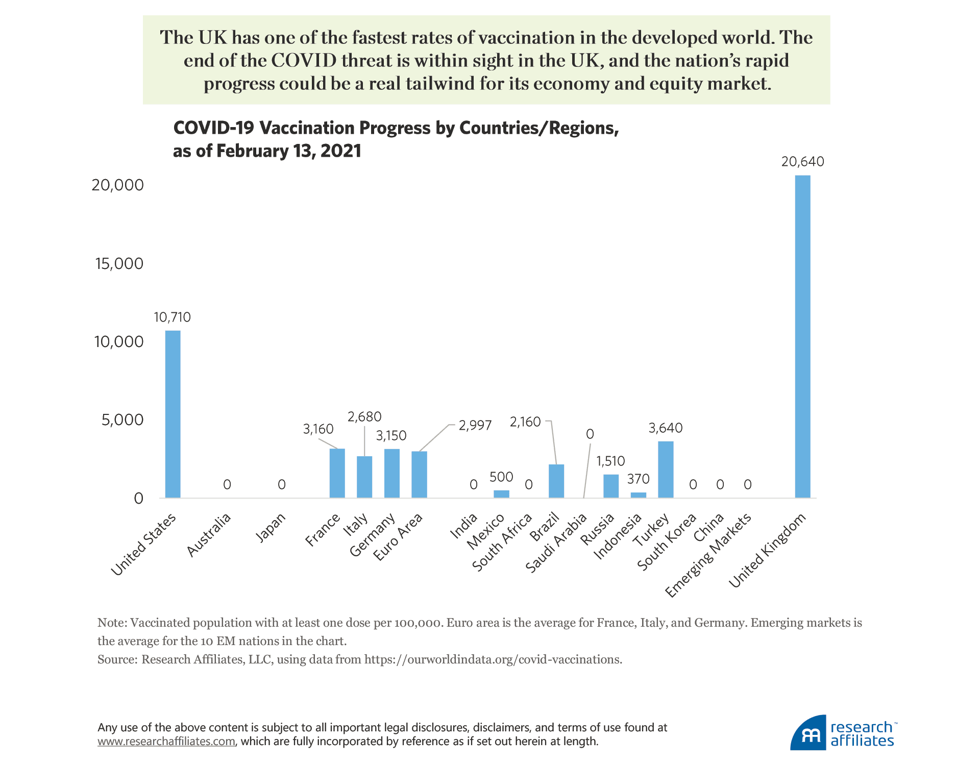 As of February 13, 2021, the United Kingdom is a clear leader in vaccination, having vaccinated 20.6% of its population with at least one vaccine dose.9 The United States is second in the running among the large economies, with 10.7% of the population having received at least one vaccine dose by mid-February 2021, and well over 1 million people “getting the jab” every single day. Other countries, however, significantly lag behind. The European Union’s progress has been deeply disappointing, with only about 3% of its citizens immunized thus far. Given that most vaccine doses were first delivered in January 2021, the United Kingdom clearly has one of the fastest rates of vaccination in the developed world. The end of the COVID threat is within sight in the UK, and the nation’s rapid progress could be a real tailwind for its economy and equity market.
