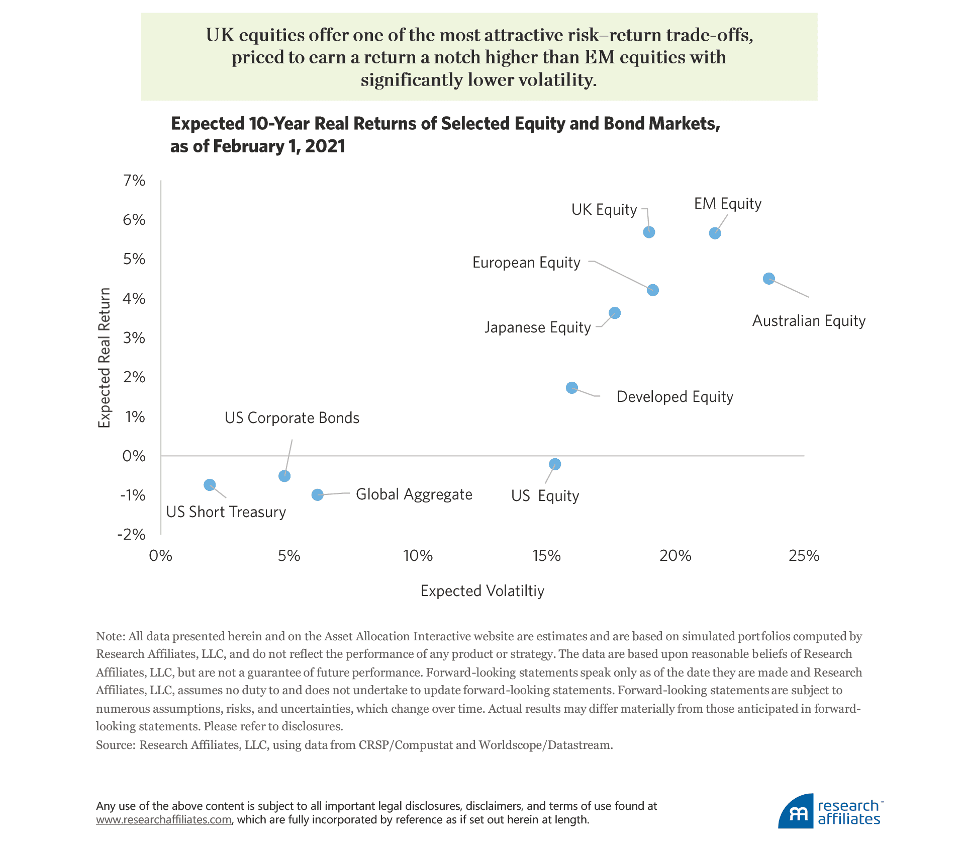 Research Affiliates’ Asset Allocation Interactive web tool uses a fairly simple building-block model that takes into account yield, growth in income, and changes in valuation multiples (or, for bonds, their spreads) to determine the expected long-term return of global asset classes. Most global asset classes, in particular the majority of fixed-income securities and US equities, are priced to deliver returns below the expected inflation rate, resulting in a negative real return. UK equities stand out as offering one of the most attractive risk–return trade-offs, priced to earn a return a notch higher than EM equities with significantly lower volatility.