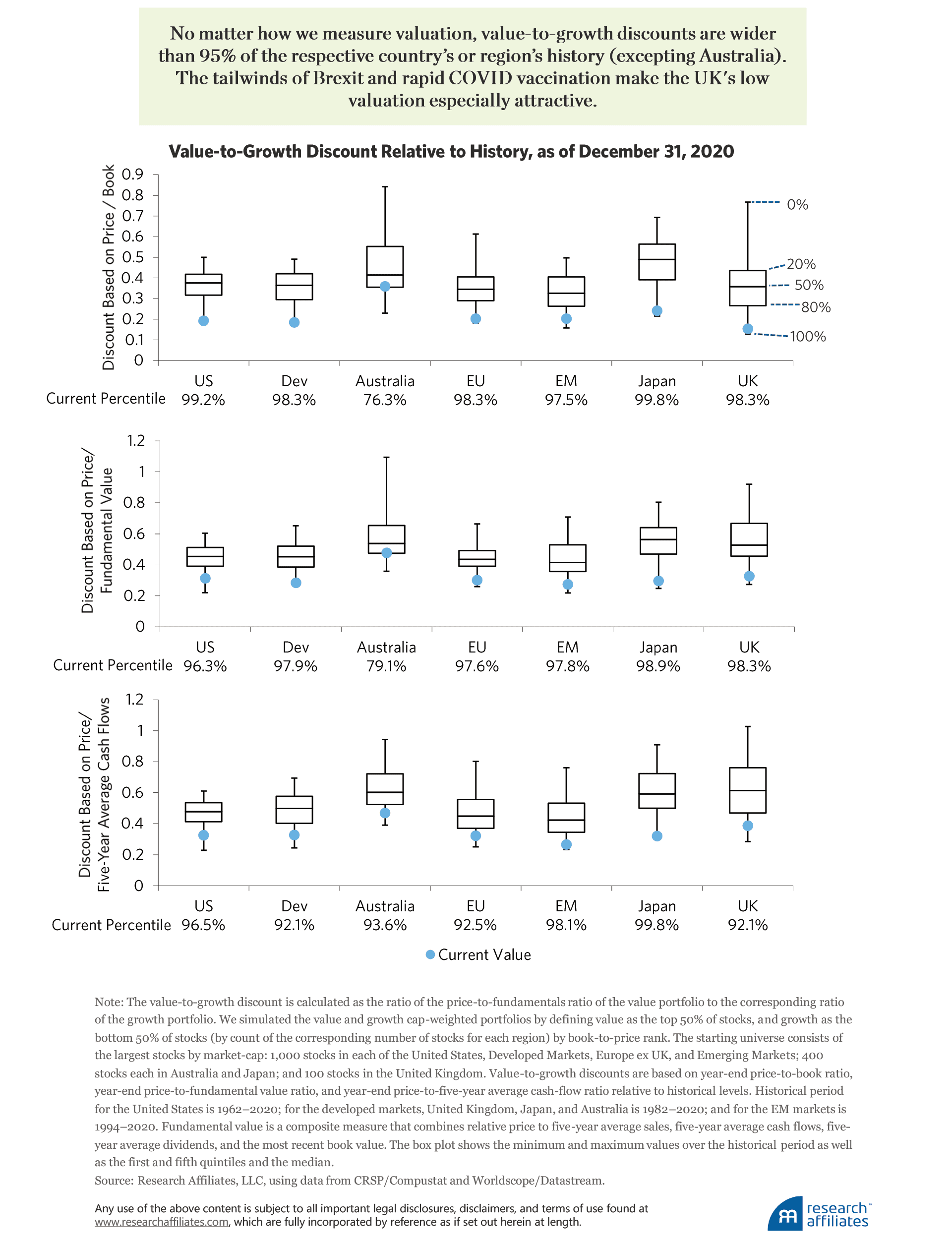 Today, around the globe, value is trading at extremely deep discounts relative to growth. Except in Australia, value-to-growth discounts are wider than 95% of the respective country’s or region’s history, in some cases falling into the cheapest percentile of all available history. The discounts are wide no matter how we measure valuation: price to book or price to fundamental value (a composite measure that combines relative price to five-year average sales, five-year average cash flows, five-year average dividends, and the most recent book value).