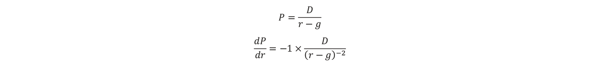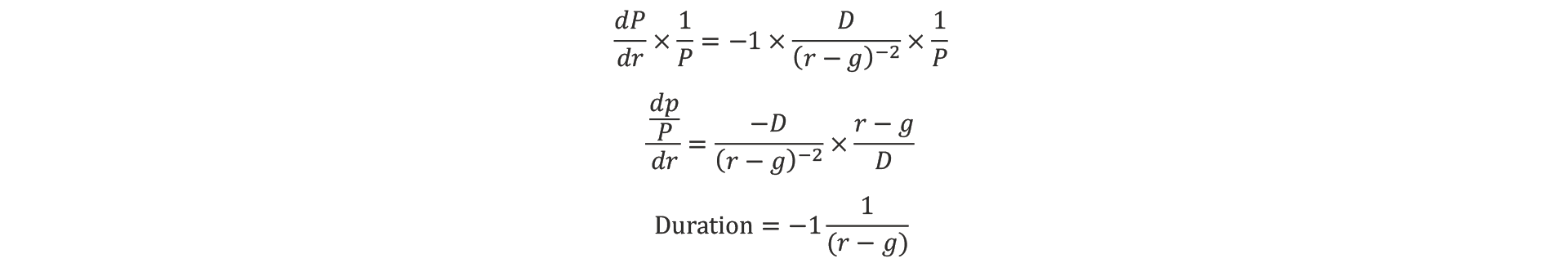 Duration captures the percentage change in a security’s price per arithmetic change in rates. To calculate the duration of an equity security, we start with the Gordon Growth Model and take a derivative with respect to rates, r,