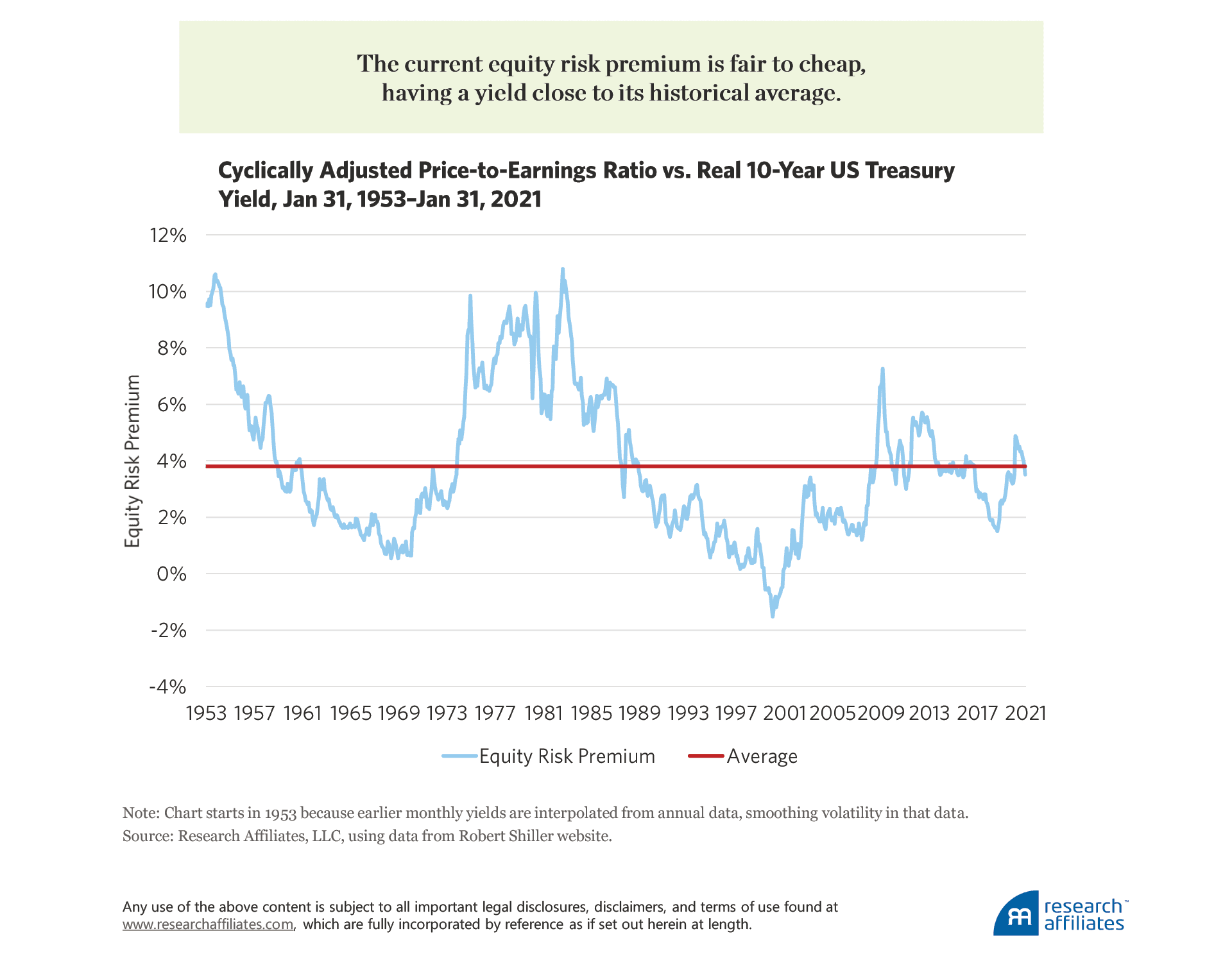 Compared to its own history, until very recently the equity risk premium has indeed been cheap, that is, it had a higher yield than its average over time. The ERP can be computed several ways. I borrow from Professor Shiller and use the inverse of the cyclically adjusted price-to-earnings ratio compared to the real 10-year US Treasury bond yield.2