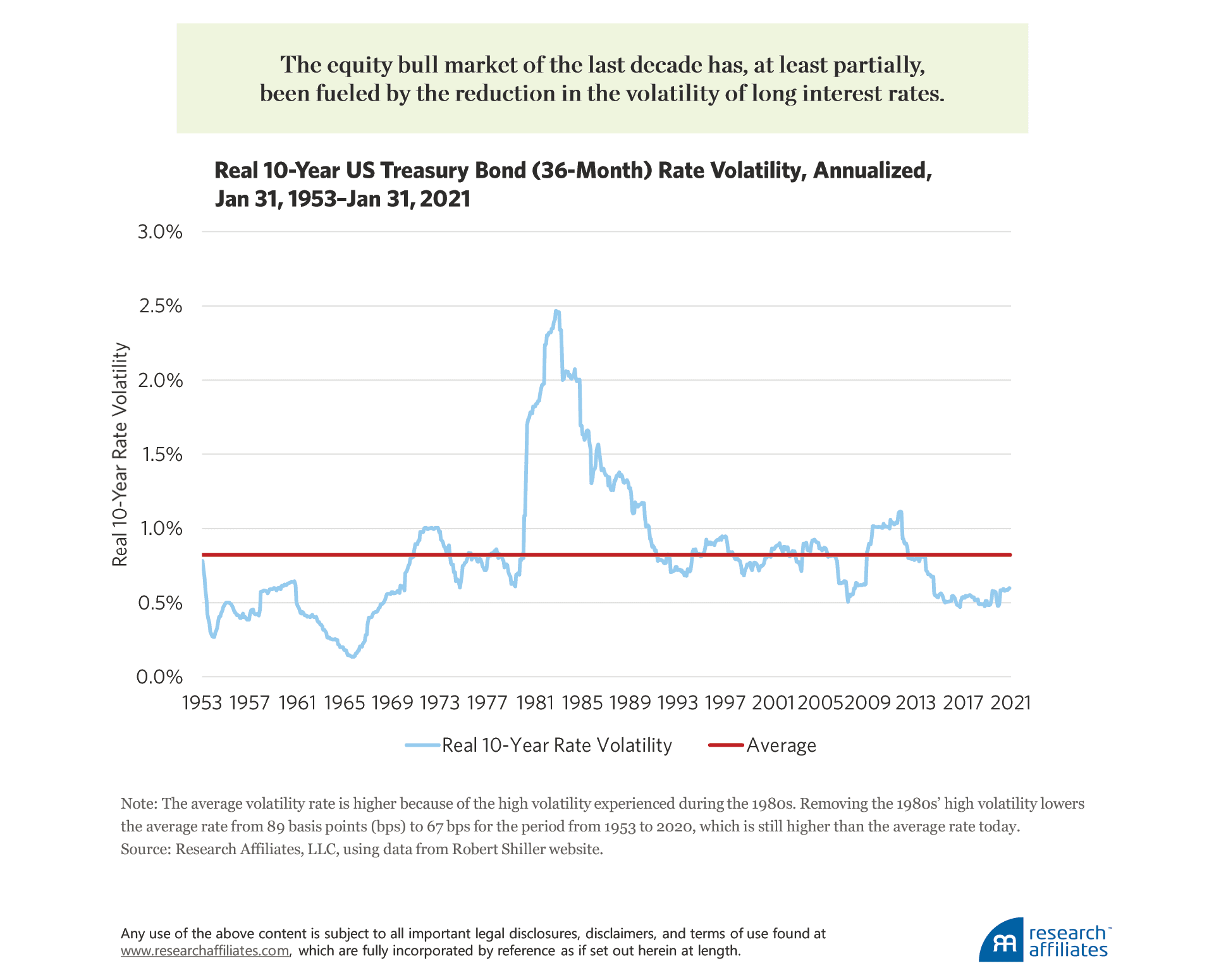 The equity bull market of the last decade has, at least partially, been fueled by the reduction in both the level and the volatility of long interest rates.3 As investors in short-volatility instruments and carry trades, which are inherently short vol, can attest, short-volatility bets can be highly profitable for a time, but can quickly blow up in your face. This is true unless additional information indicates the probability of a blow out in rates is even lower than it should be under normal circumstances.