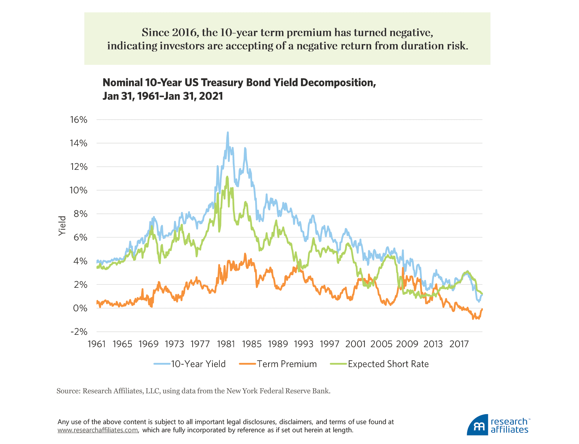 Recalling basic investment theory, bond yields have two distinct drivers: the expectations hypothesis and the term premia. The former is simply the idea that long-term yields are determined by the expected path of short-term yields into the future.4 In a world of zero yield uncertainty, an investor should be ambivalent between owning a long-term bond to maturity or buying and rolling over a series of short-term bonds.