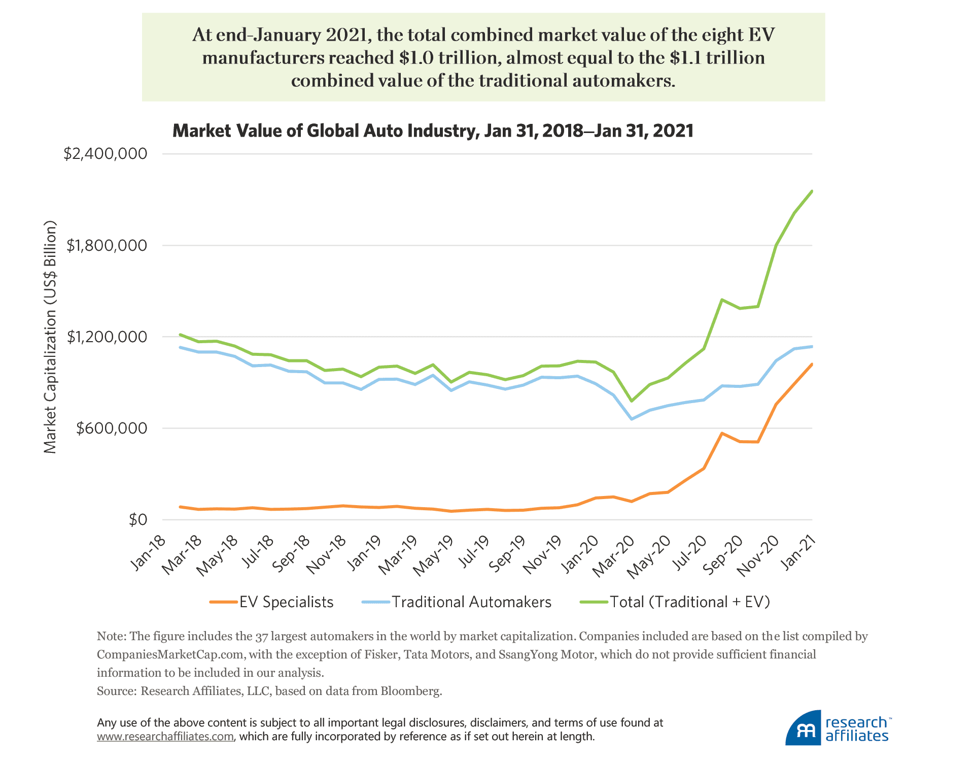 In 2020, the market capitalization of the worldwide auto industry more than doubled. The driving force was the “big new EV market.” As a result, the stock price of virtually every EV specialist, including more established firms such as Tesla as well as a host of new start-ups, all skyrocketed. Even the prices of traditional auto makers rose handily when they announced their own EV plans.