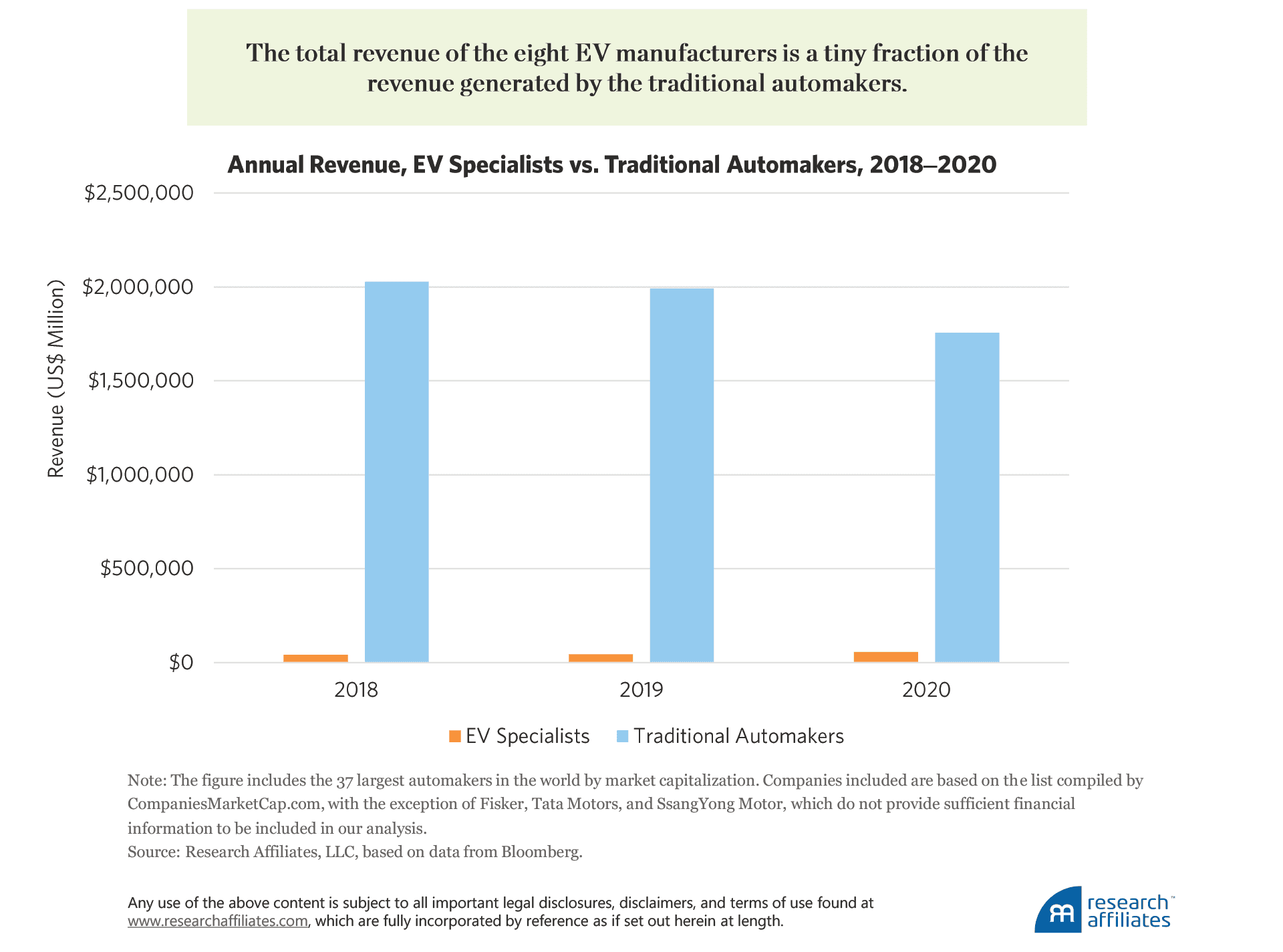 In contrast to their astounding growth in market value, EV specialists’ combined total revenues remain as they have over the last three years at only a tiny fraction of the revenues generated by the traditional automakers: 1 to 42 on average over the three-year period. Furthermore, the entire industry’s total revenue fell in 2020 even as share prices skyrocketed.