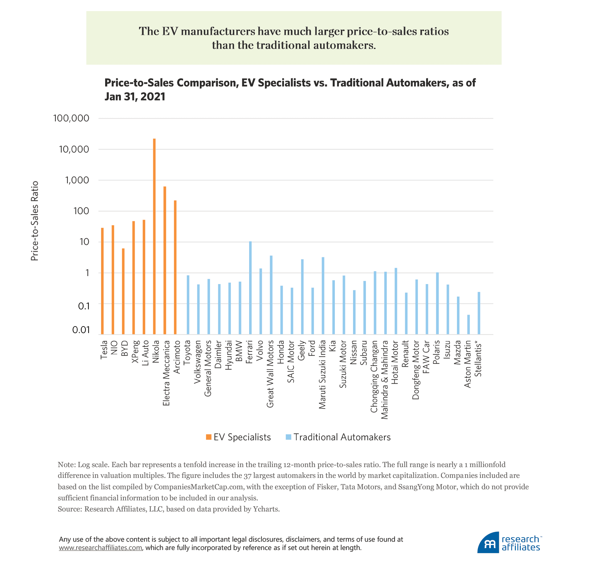 When we exclude Tesla from the EV specialist group’s $1 trillion market-cap at end-January 2021, the combined market value of the seven other EV companies is $268 billion, one-third Tesla’s value. What could we buy for $268 billion? We could buy not only Toyota—the largest traditional automaker by market capitalization ($228 billion at end-January 2021) and the most profitable automaker—but also Ferrari, the automaker with the highest profit margin. $268 billion is also the approximate market capitalization of all major German automakers—Volkswagen, Daimler, and BMW—which together account for 17.6% of global auto market sales.9