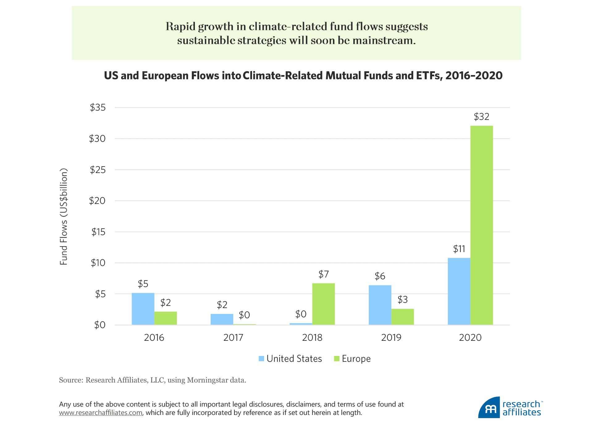 The rapid growth in climate-related fund flows in Europe suggests sustainable strategies will soon become mainstream.