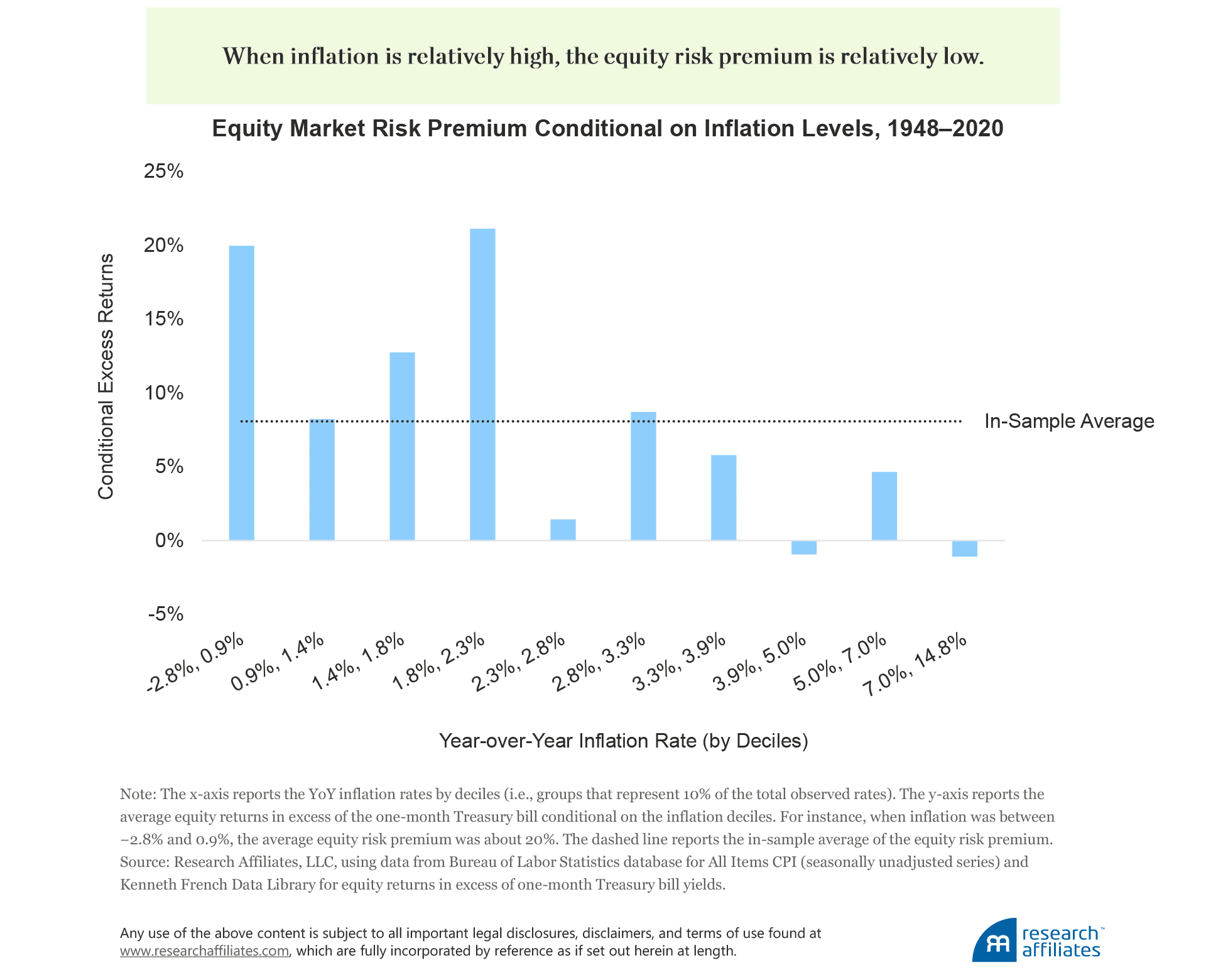 Multiple articles document that equity markets tend to underperform when inflation is relatively high.1 To appreciate this relationship, we examine the average excess returns of the US stock market conditional on the contemporaneous year-over-year (YoY) inflation level for the period January 1948–December 2020. We find that when inflation is relatively high, the equity risk premium is relatively low, and is a statistically significant relationship. Unsurprisingly, today’s renewed inflation fears are dominating conversations in the investment industry. The determination of governments and central banks to provide support to their economies is leaving investors wondering whether prices may spiral as they did in the 1970s when inflation reached double digits.