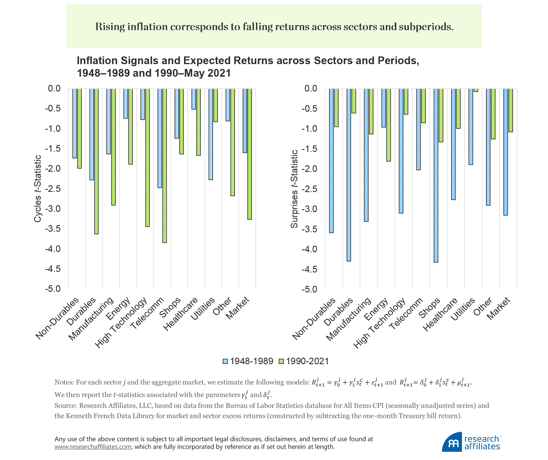 Related to this point, we note that the evidence we present that the equity market has underperformed when inflation was relatively high is not obviously translatable to an investment strategy. Indeed, the mean of the inflation rate has varied across decades as has the notion of “high” and “low” inflation. A sustained rate of 5% inflation is arguably high in today’s world, but was not out of the ordinary just 30 years ago. Inflation cycles and surprises are related to the direction of the inflation rate, rather than to its level.