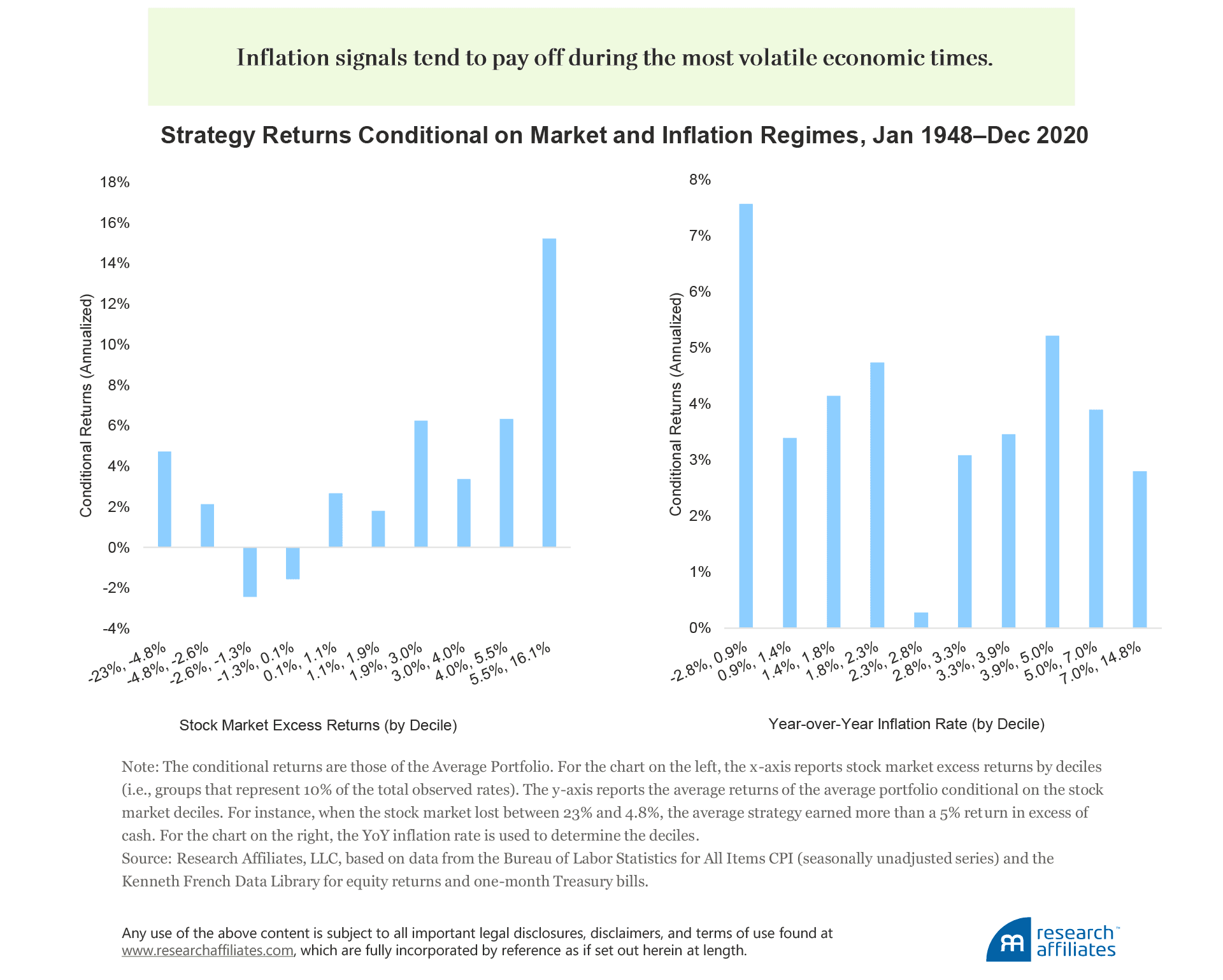 We highlight how inflation signals have worked consistently well across decades in addition to inflation and market regimes. Unlike commodities, tactical strategies based on inflation signals appear to perform well during both positive and negative market environments.
