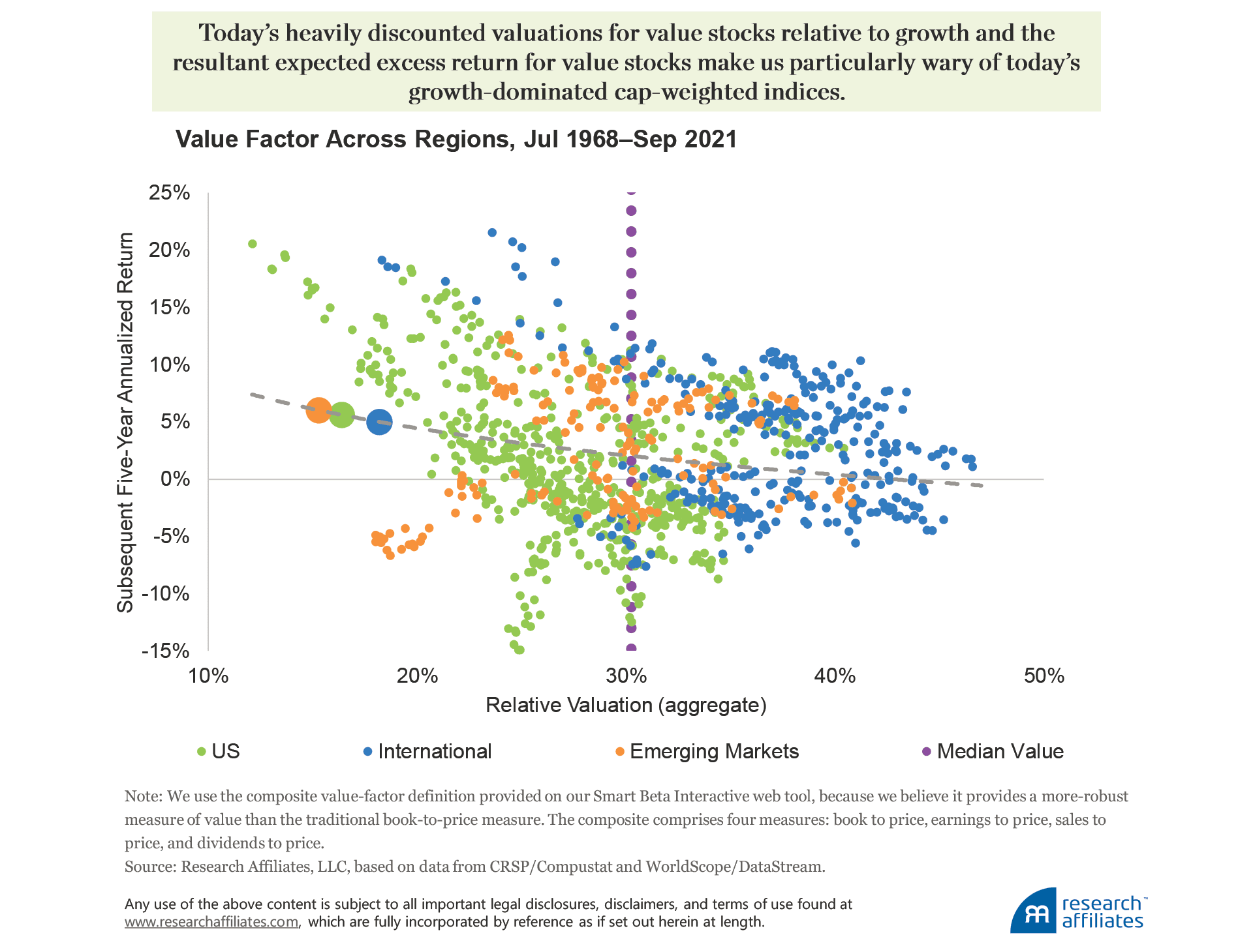 Of course, just as our regular readers know that we prefer multiple measures when valuing firms, so too they know we prefer an alternative to cap-weighted indices, especially when the valuation dispersion between cheap and expensive companies is as historically wide as it is today. Arnott et al. (2021) show that value investing is not broken. Value stocks have merely become far cheaper than they normally are relative to growth stocks. The elevated discount for value stocks exists both within and outside the US market.