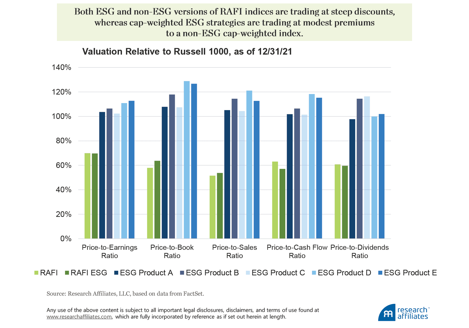 Because ESG is a preference, not a strategy, investors can incorporate their ESG principles within a wide range of investment strategies, including non-cap-weighted indices. Today, the RAFI ESG strategy allows investors to invest according to their ESG principles and still maintain a valuation discount relative to the market at a time when value appears attractively priced.
