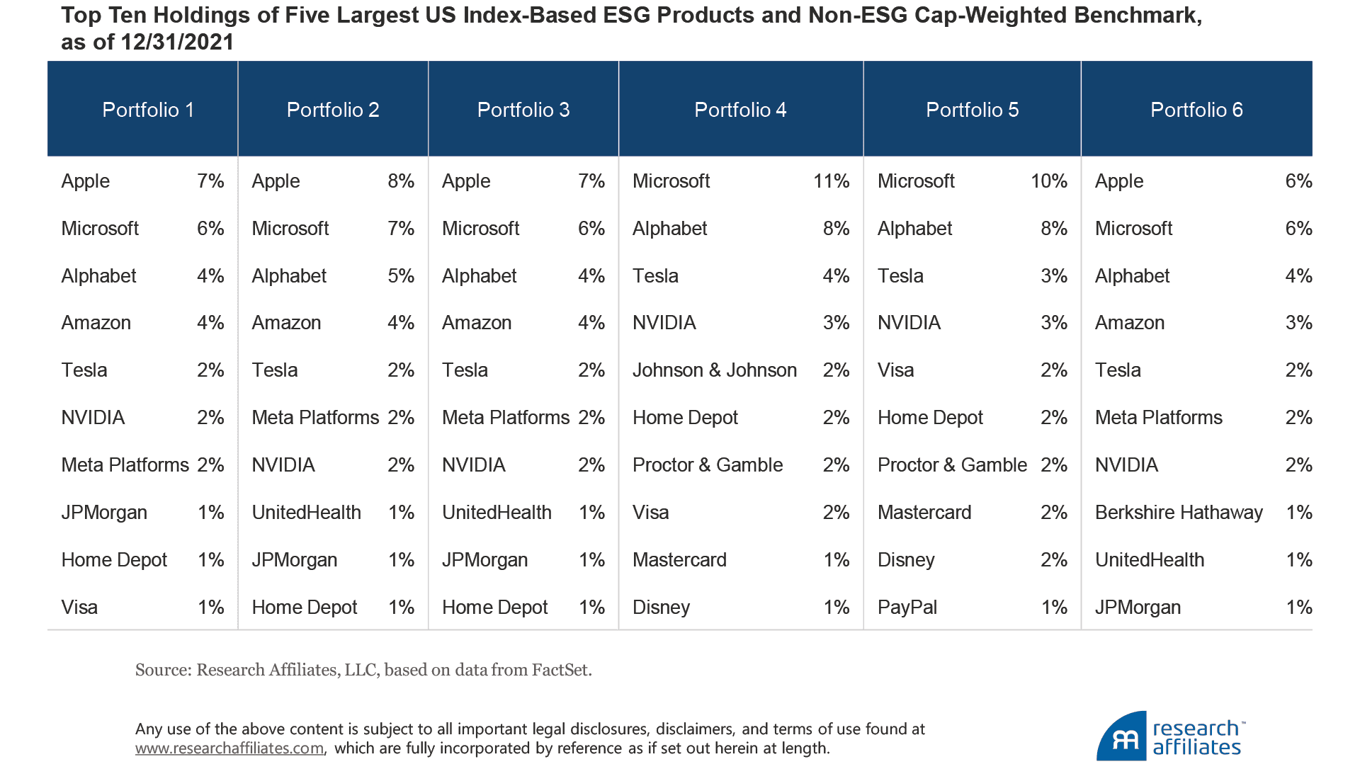 The following table lists the top ten holdings for six portfolios: the five largest ESG vehicles and a cap-weighted benchmark. We intentionally omit labels. Can you tell which vehicle is the non-ESG portfolio? Johnson & Johnson, Berkshire Hathaway, and PayPal are the only companies that are unique to individual portfolios. Every other company is included in two or more strategies.