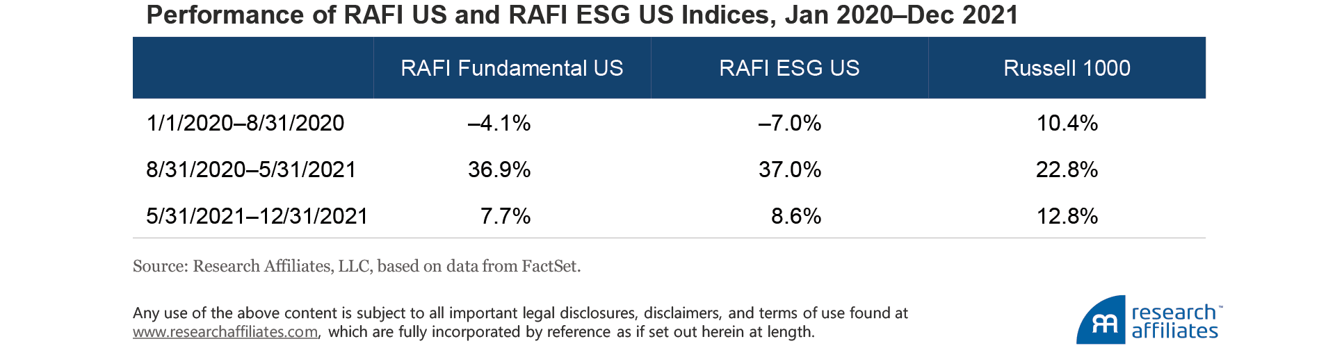 The RAFI™ index strategy offers one alternative to a cap-weighted index. By selecting and weighting companies based on fundamental measures of size—sales, cash flow, dividends plus buybacks, and book value plus intangibles—the RAFI approach represents a contrarian portfolio that rebalances out of the very mega-cap growth companies that currently dominate cap-weighted indices due to their significant price appreciation. When multiple dispersion between growth and value stocks is low, market-cap and RAFI indices will appear quite similar. As the market’s willingness to pay a premium for growth increases, the difference between cap-weighted and RAFI indices will also grow. RAFI indices exhibit a dynamic value exposure regardless of whether they incorporate an ESG methodology.