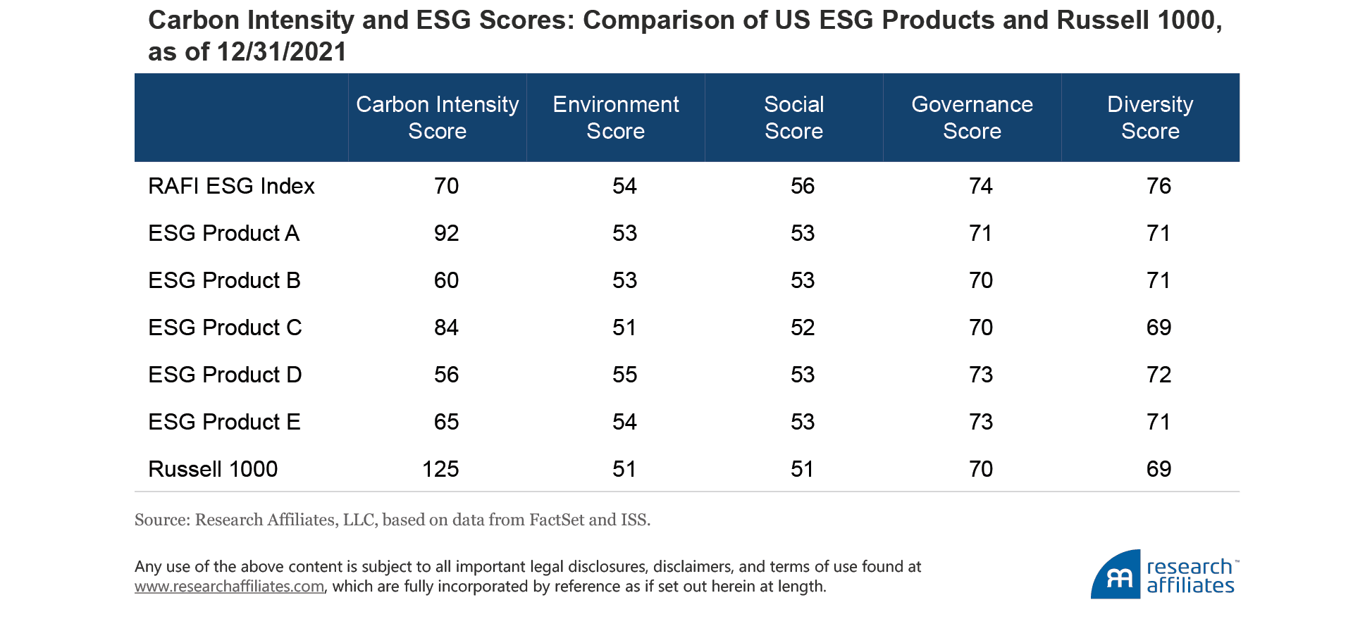 In addition to reducing carbon intensity, the RAFI ESG Index goes beyond many of the popular strategies, which rely largely on exclusions of firms with poor ESG scores and specific companies that belong to controversial industries. The RAFI ESG Index excludes any company that ranks poorly across any of five different groups of ESG metrics: environmental, social, governance, financial discipline, and diversity. Further, the RAFI ESG strategy incorporates a firm’s ESG score in its index weight.