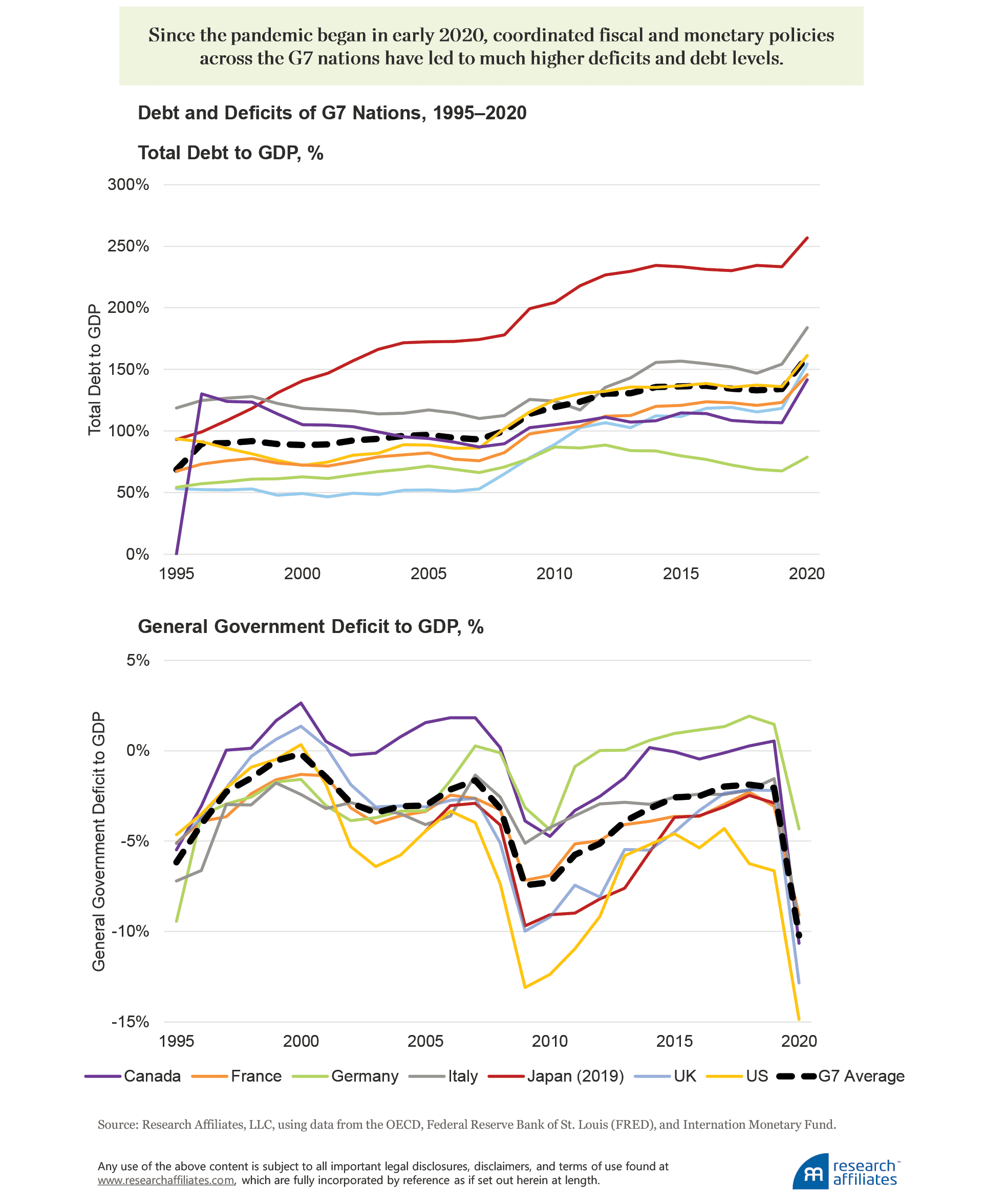 Collectively across the G7 (United States, United Kingdom, Germany, France, Canada, Japan, and Italy) total debt levels as a percentage of GDP have doubled over the last 25 years, jumping from an average 80% in 1995 to over 160% in 2020. Over the quarter-century span, the sharpest annual increase in debt to GDP occurred in 2021, well outpacing the 14% surge during the 2008–2009 global financial crisis (GFC).