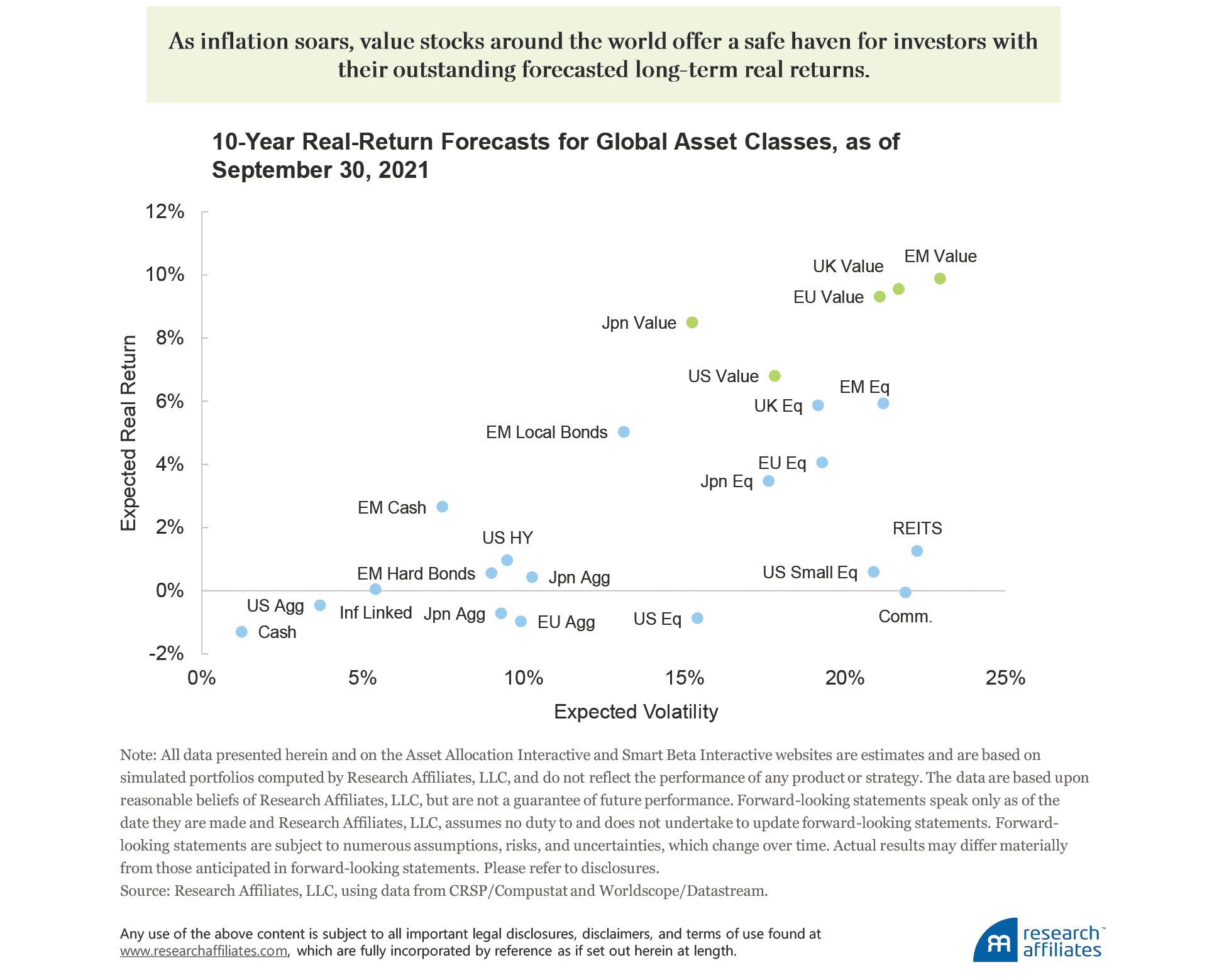 Investors can take steps now to position their portfolios for a high-inflation environment by allocating to value stocks around the globe as well as taking advantage of below-zero real interest rates to finance purchases of real assets, whose prices tend to rise with inflation.