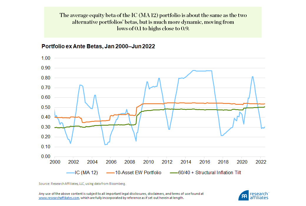 We have already demonstrated that the full-period realized equity beta of the portfolios is very similar: 0.54 for the IC (MA 12) portfolio, 0.54 for the 10-Asset EW portfolio, and 0.51 for the 60/40 plus structural inflation tilt portfolio. Now we will focus on the portfolios’ ex ante equity beta (relative to the MSCI All Country World Index), an estimate of the future equity beta of the portfolio based on the current holdings at each point in time. From January 2000 through June 2022, the average equity beta of the IC (MA 12) portfolio is about the same as the two alternative portfolios’ betas, but is much more dynamic, moving from lows of 0.1 to highs close to 0.9.