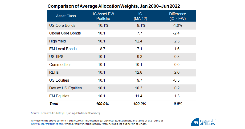 Across the entire backtest period, the average weights of the IC (MA 12) portfolio, whose asset allocations are dynamically changing, are remarkably similar to those of the equally weighted benchmark. Therefore, the source of the IC portfolio’s value-add must be through the beneficial timing of its allocations, rather than its structural exposures.